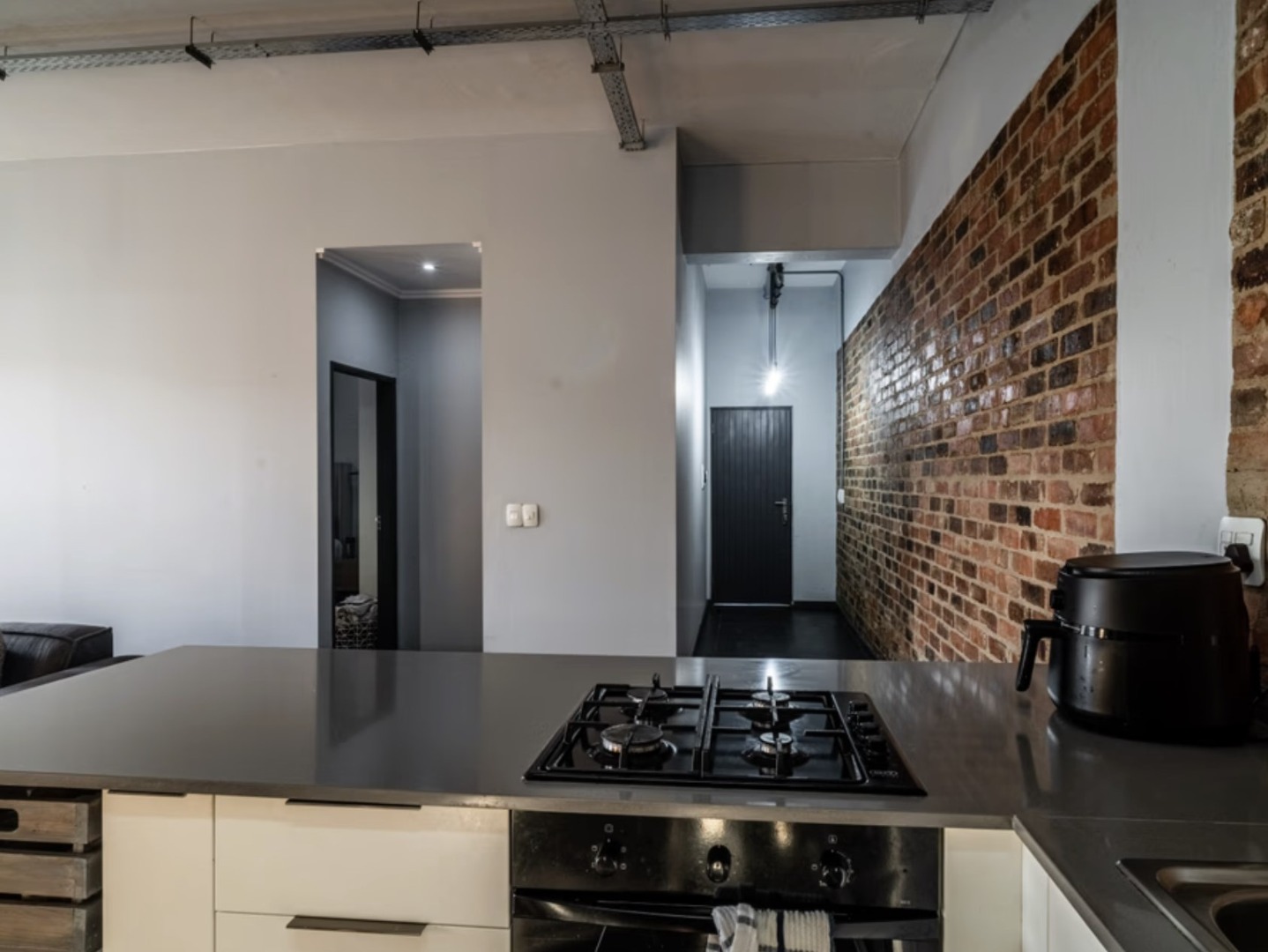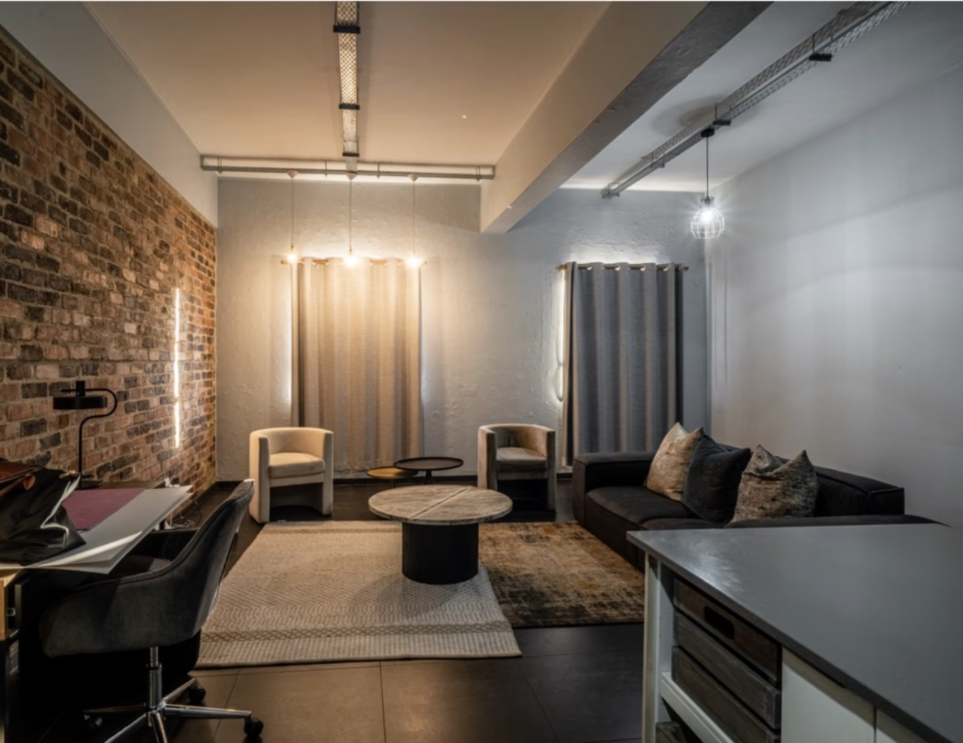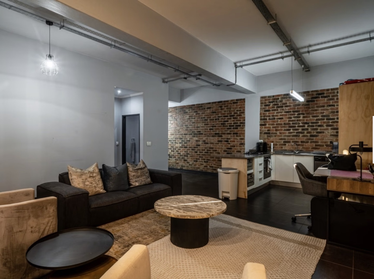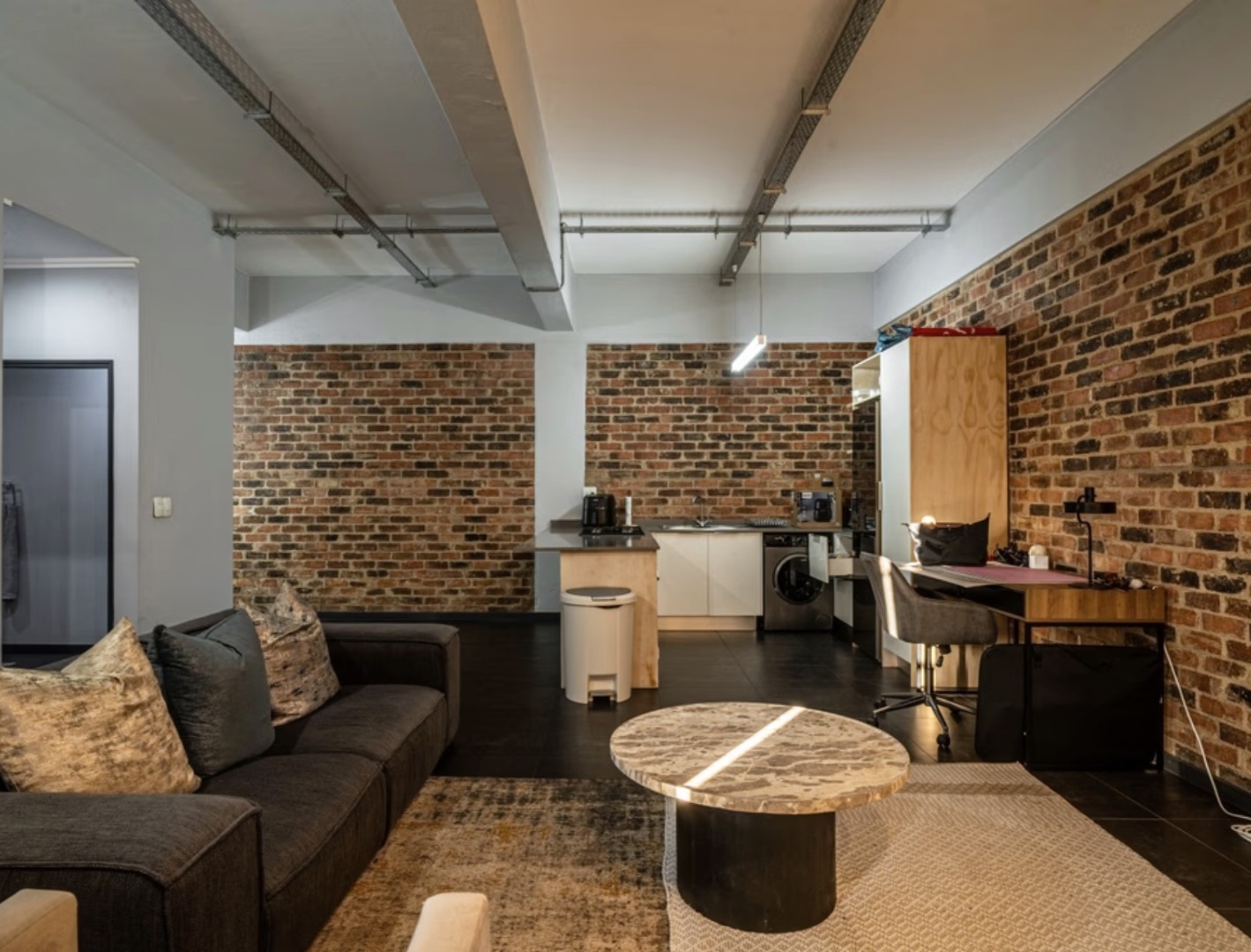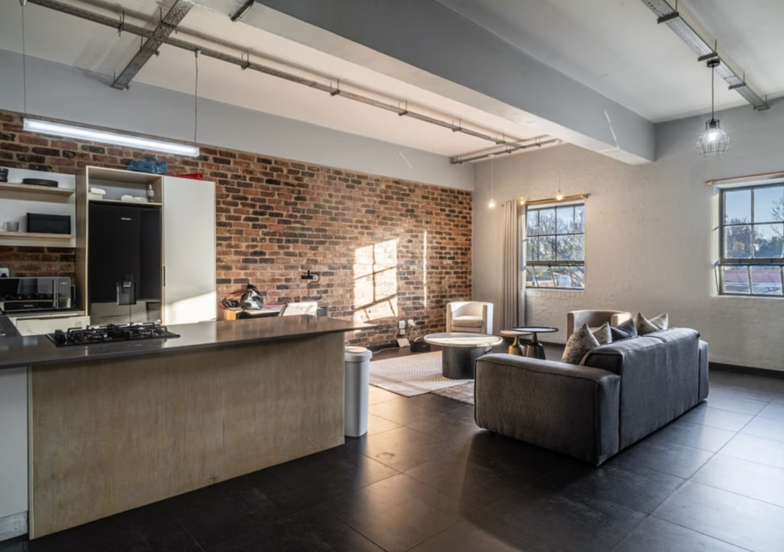 The open-plan living area is spacious and inviting, flowing seamlessly into a modern kitchen fitted with quality cabinetry and ample counter space, ideal for entertaining or relaxed evenings at home. The double-volume ceilings and large windows enhance natural light, creating a bright yet edgy atmosphere unique to loft living.