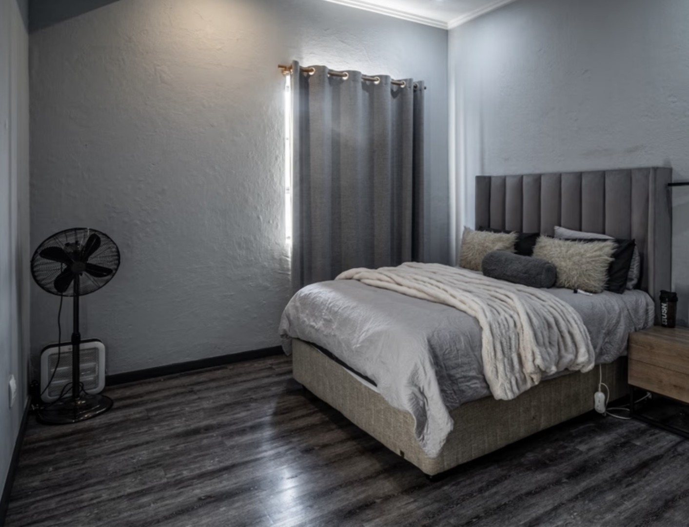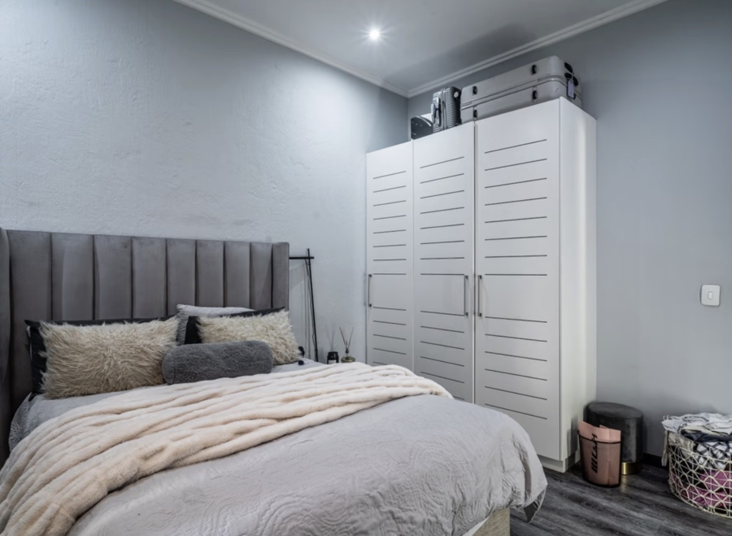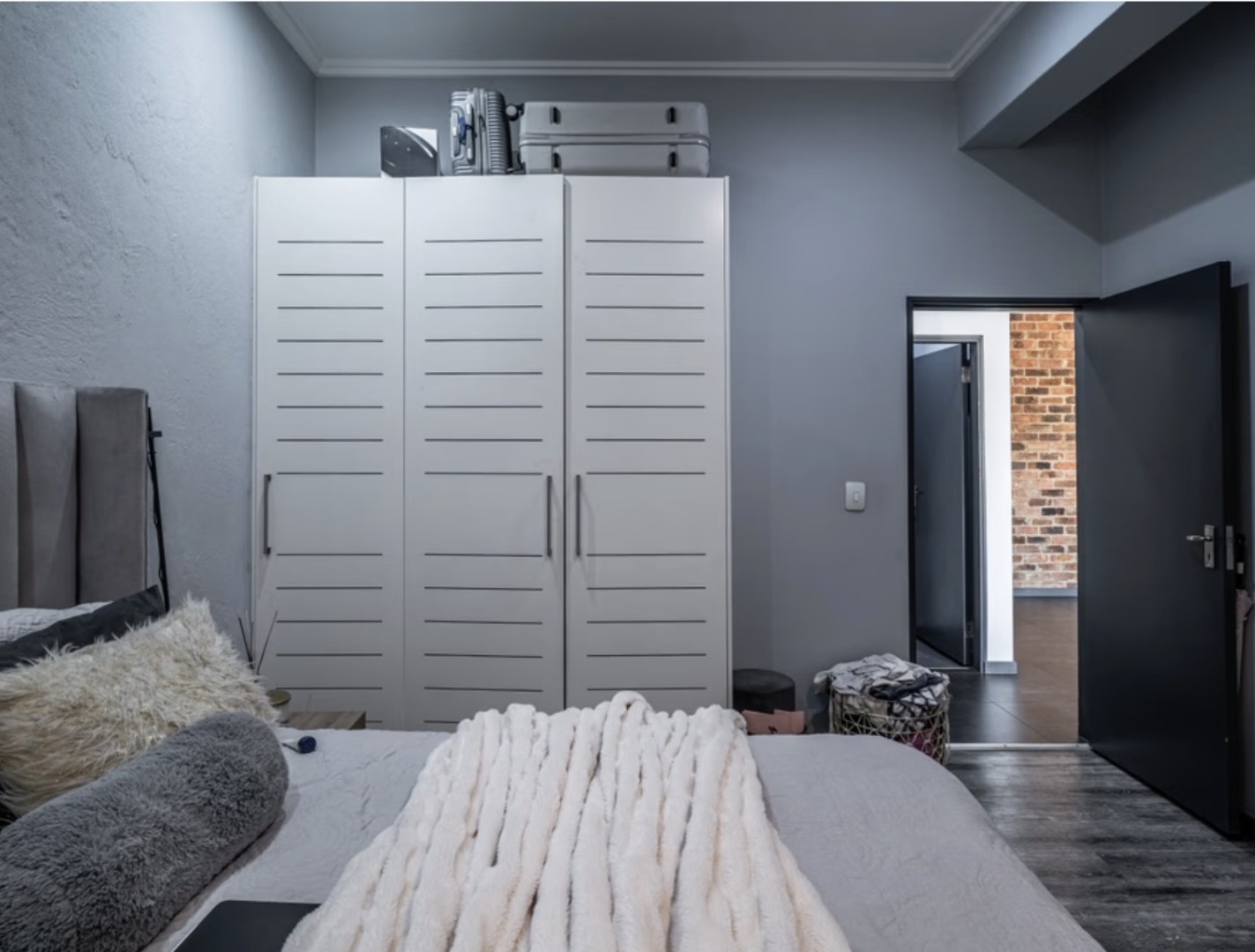 The bedroom is well-sized and beautifully finished, offering a calm and private retreat from the open living space. With built-in cupboards and modern flooring, it provides both style and practicality.