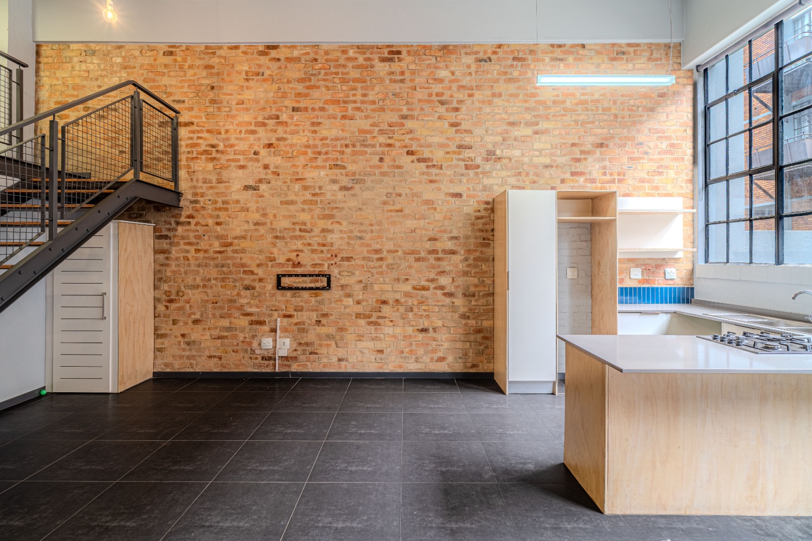 Boasting exposed brick feature walls, soaring ceilings, and oversized industrial-style windows, this home is filled with natural light and character. The expansive open-plan living and dining area flows effortlessly into a sleek, contemporary kitchen fitted with a centre island, ample cupboard space, and quality finishes, ideal for entertaining and everyday living.