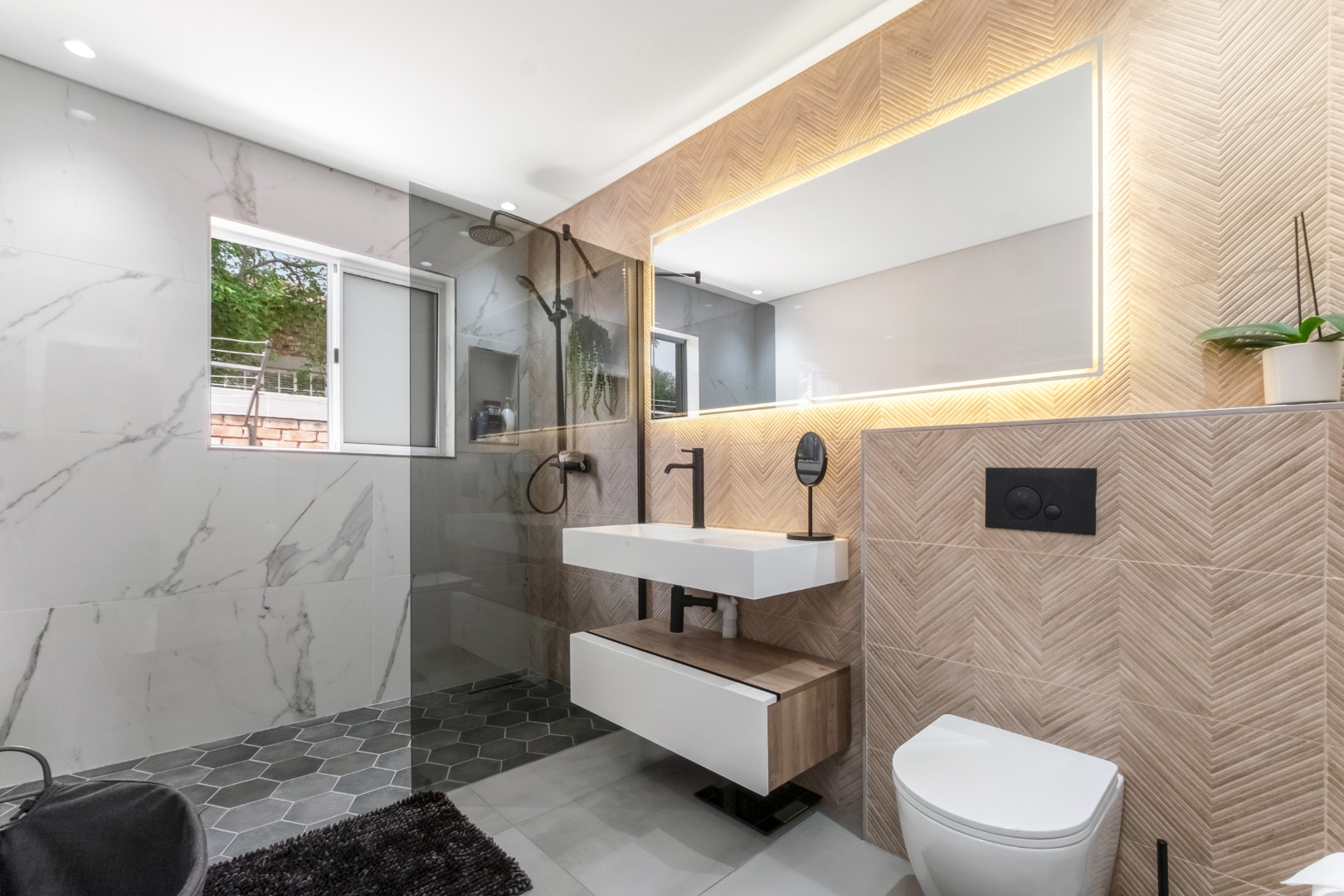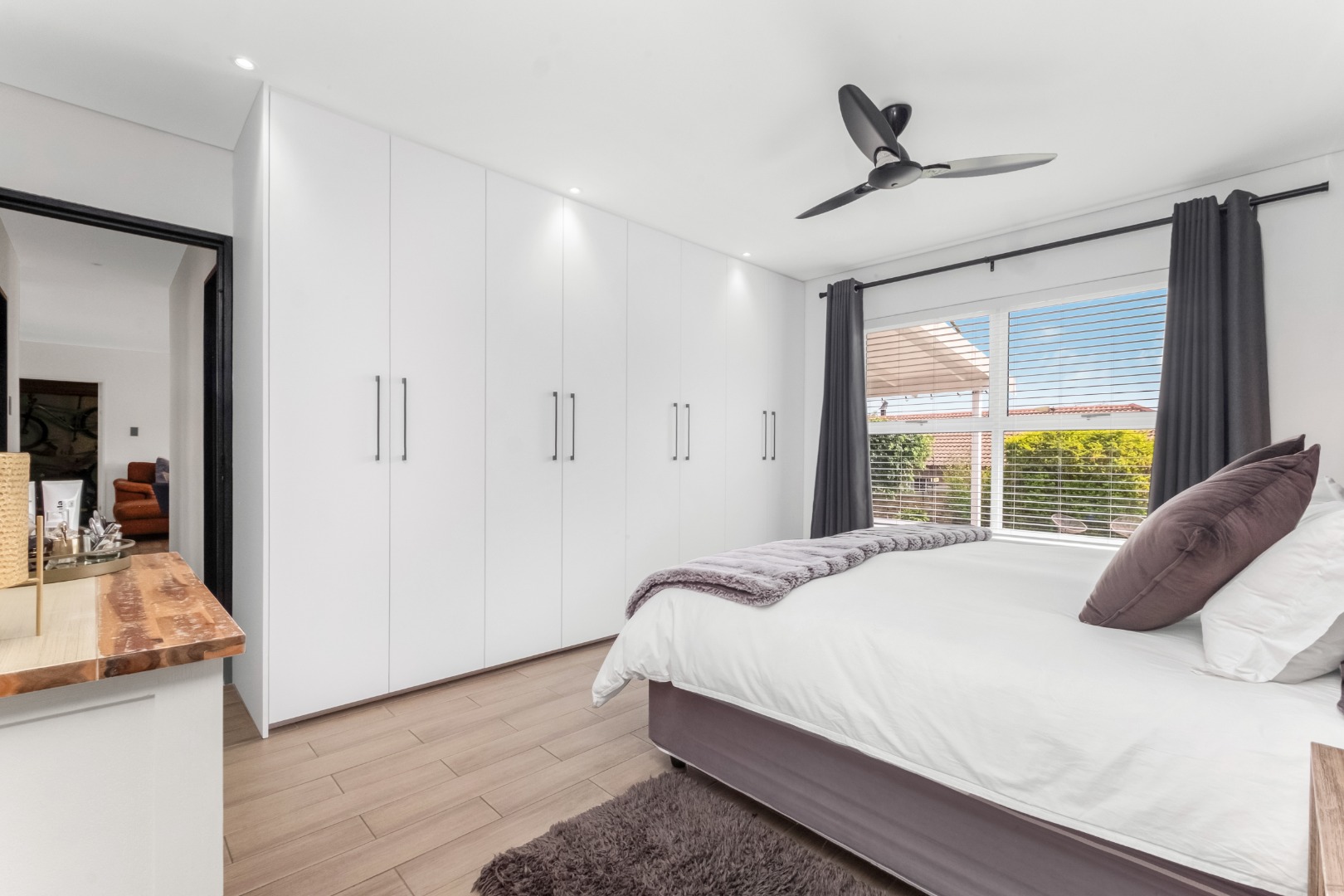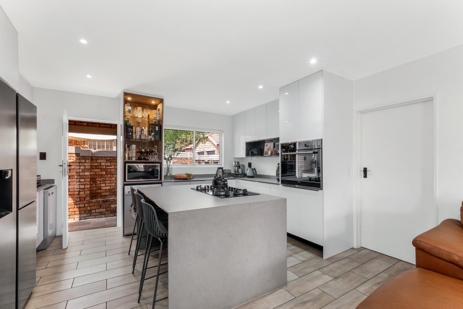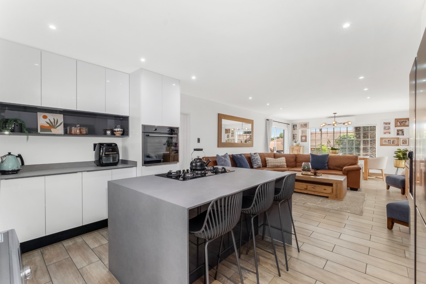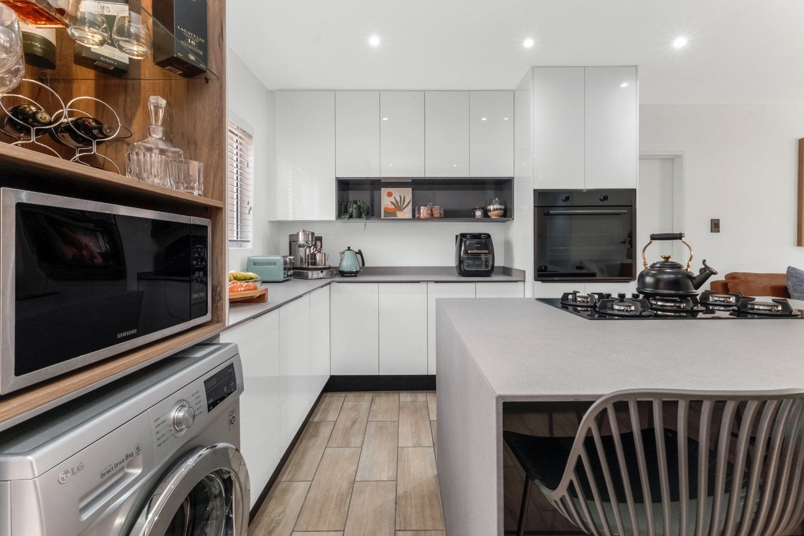 The kitchen features gloss finish cupboards, cement-grey counters and a 900mm gas glass hob, with a beautiful open bar display. Space for 2 wet appliances and a plumbed fridge. Drawers and cupboards, including pantry cupboard, are soft close. Eyelevel oven and space for a microwave.