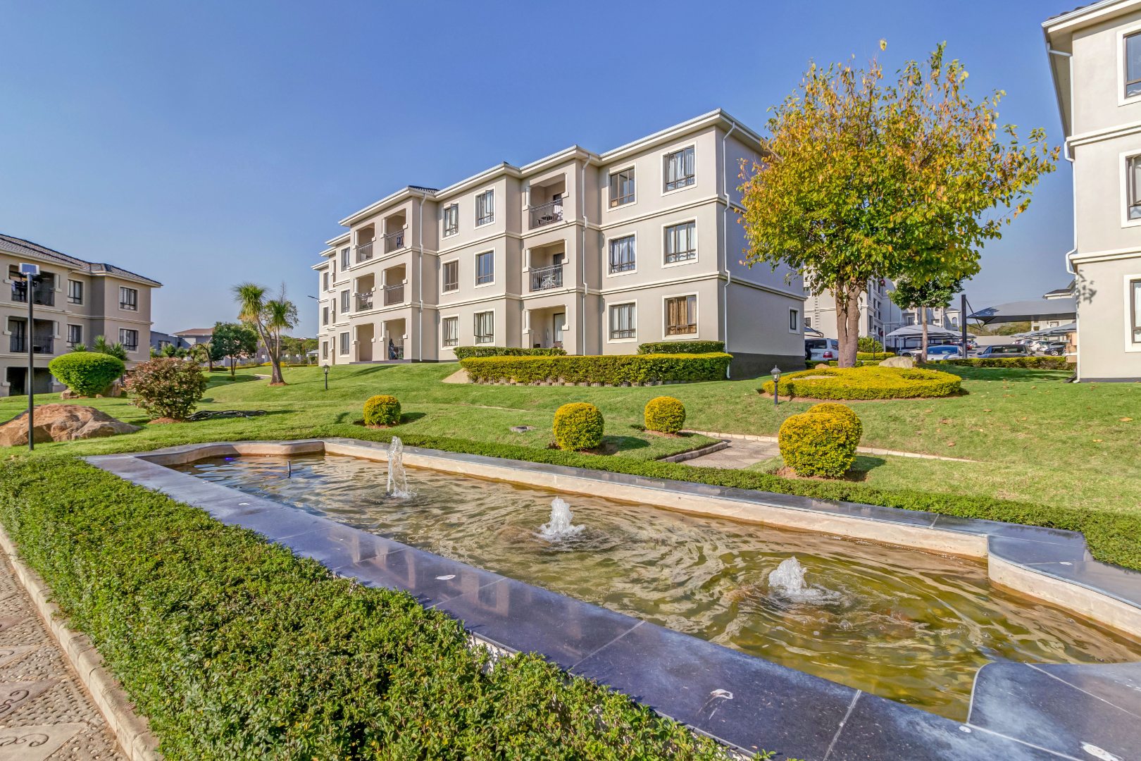 Step outside to your private patio, offering direct access to the estate's meticulously manicured gardens – a verdant oasis. Residents are privileged to enjoy a host of world-class amenities, including a sparkling communal swimming pool with a chic wooden deck, perfect for sun-drenched afternoons, and a well-maintained tennis court for active pursuits. A dedicated parking bay ensures convenience.