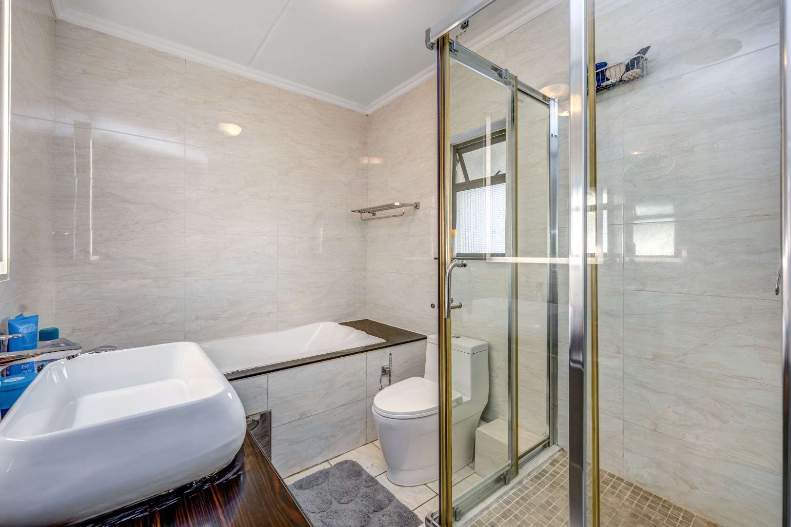This exquisite apartment features two serene bedrooms, offering private sanctuaries for rest and rejuvenation. The master suite benefits from a luxurious en-suite bathroom, while a second well-appointed bathroom serves the additional bedroom and guests. Each space is meticulously crafted with clean tiled flooring and neutral palettes, creating an atmosphere of refined comfort.