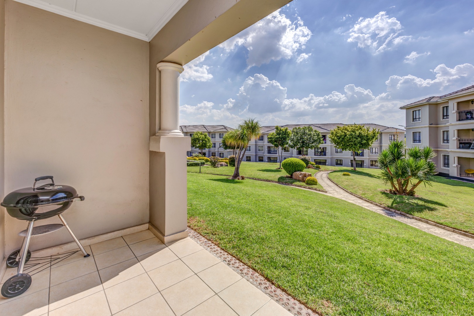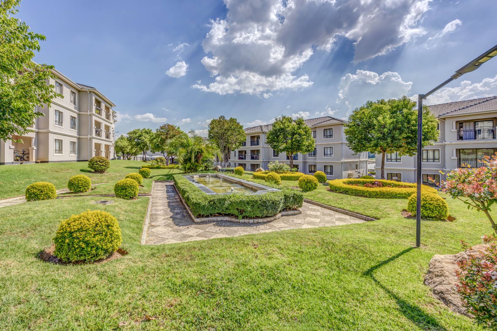 Step outside to your private patio, offering direct access to the estate's meticulously manicured gardens – a verdant oasis. Residents are privileged to enjoy a host of world-class amenities, including a sparkling communal swimming pool with a chic wooden deck, perfect for sun-drenched afternoons, and a well-maintained tennis court for active pursuits. A dedicated parking bay ensures convenience.