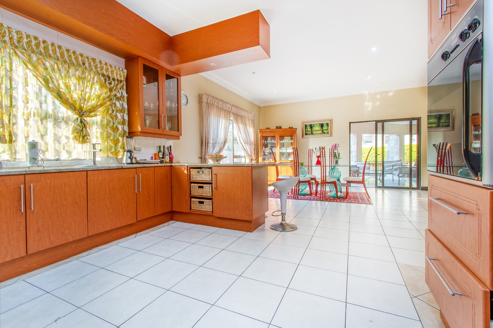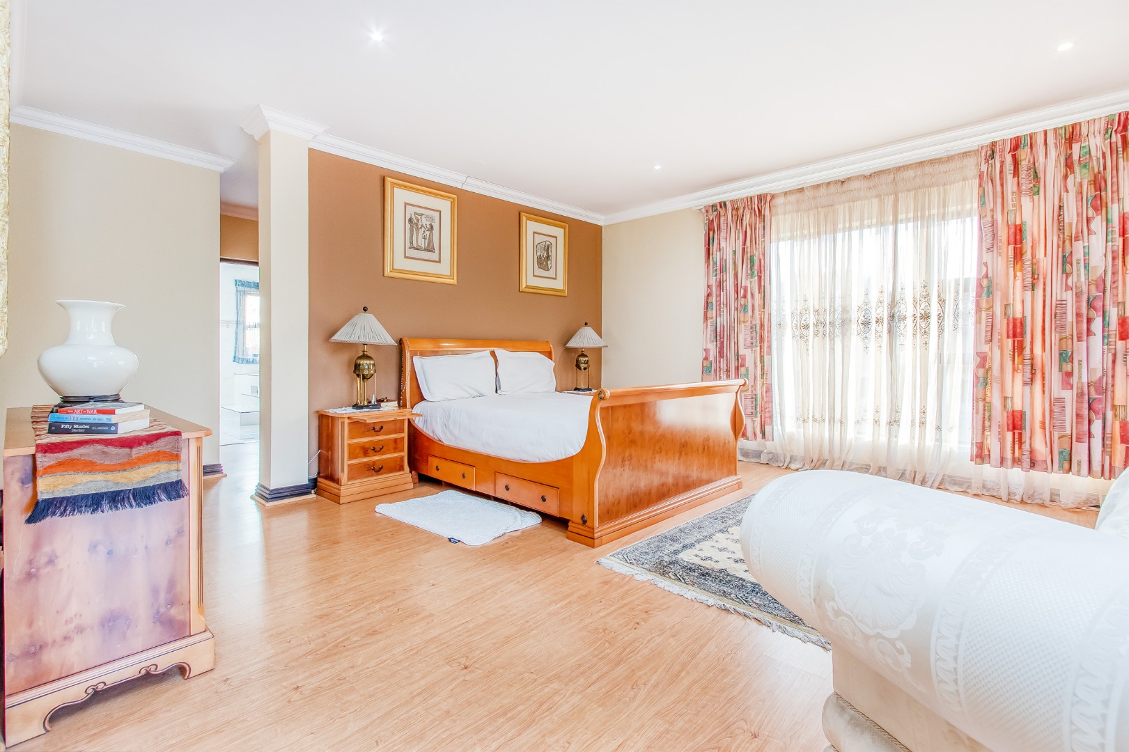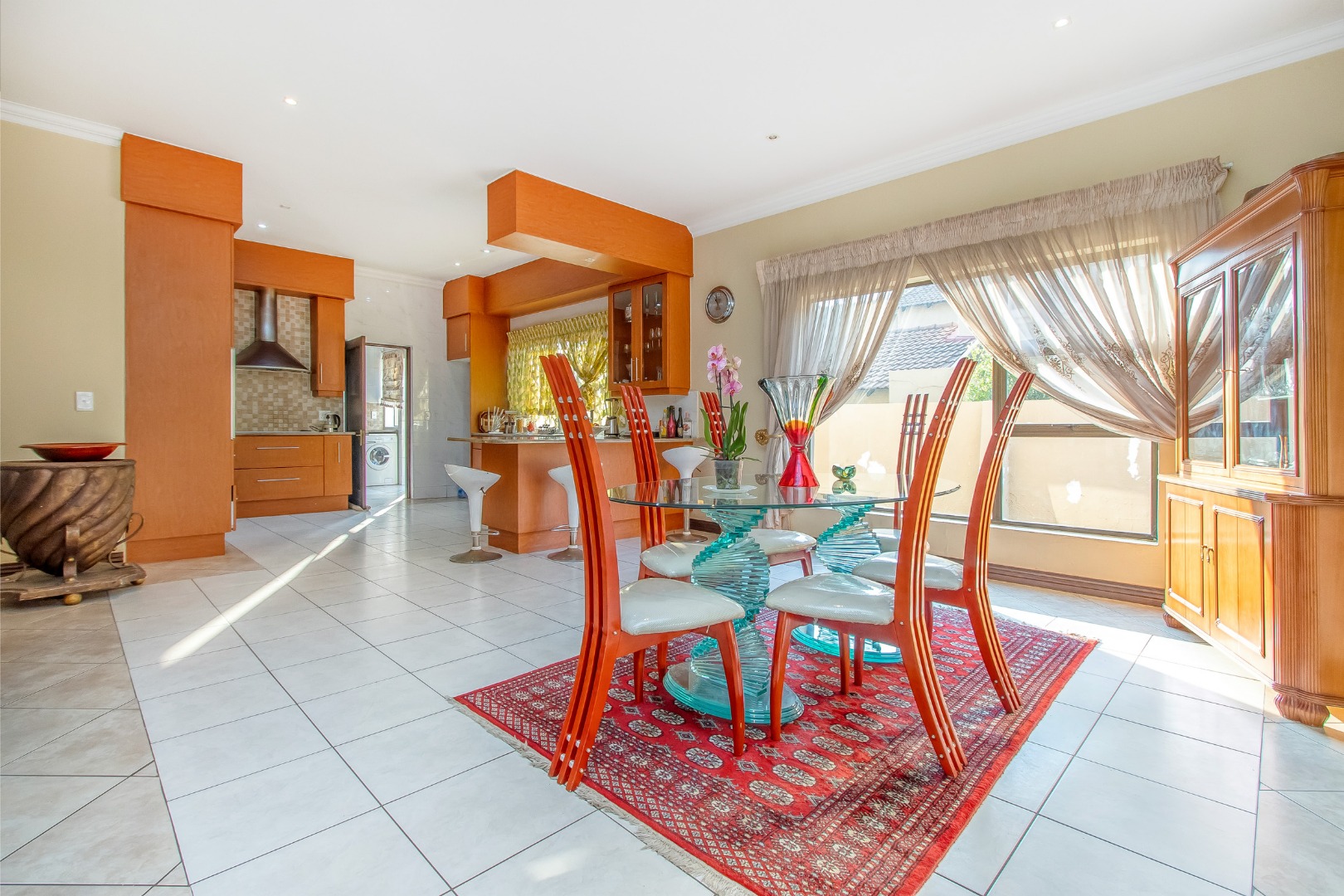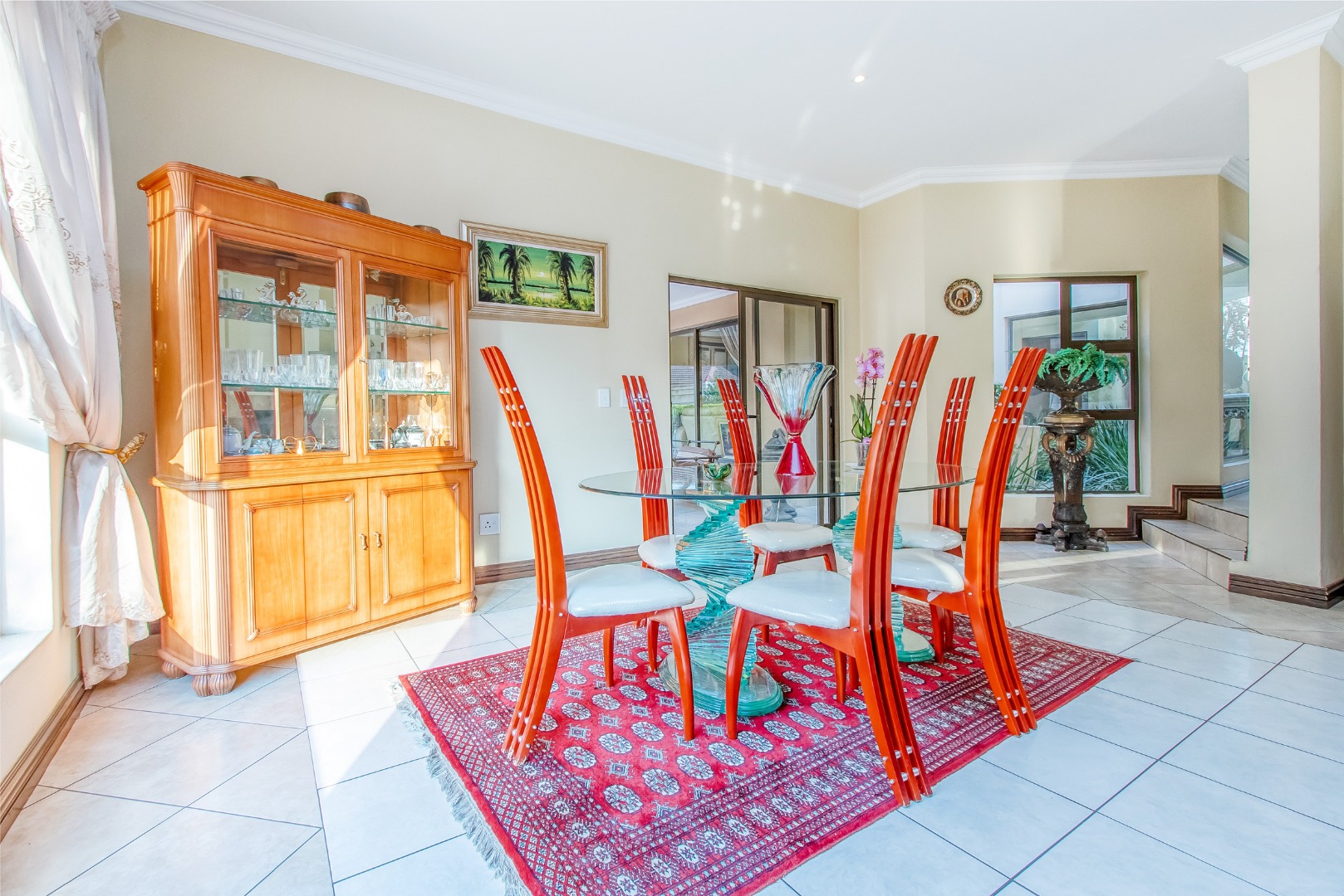 Designed with entertaining in mind, the open-plan dining and entertainment area flows seamlessly to the garden and poolside patio, where a built-in braai invites elegant outdoor gatherings under the stars.