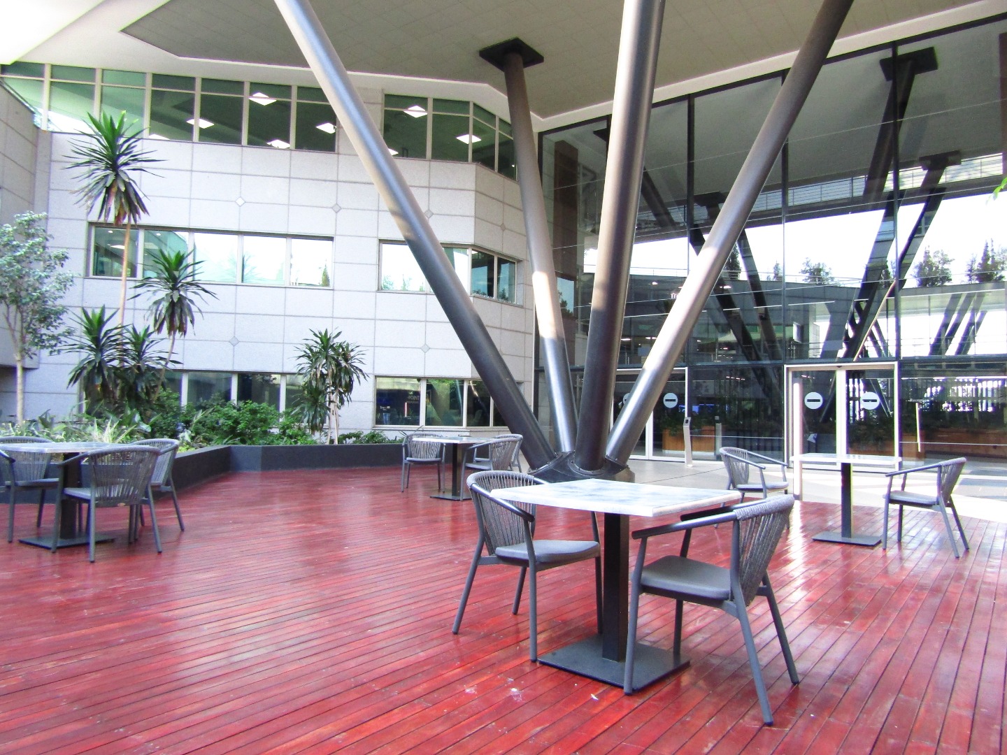 Tenants can unwind or network in the elegant outdoor patio area and enjoy the convenience of an on-site catering kiosk, creating a vibrant, community-driven workspace. Surrounding landscaped gardens and clear directional signage further enhance accessibility and visual appeal.