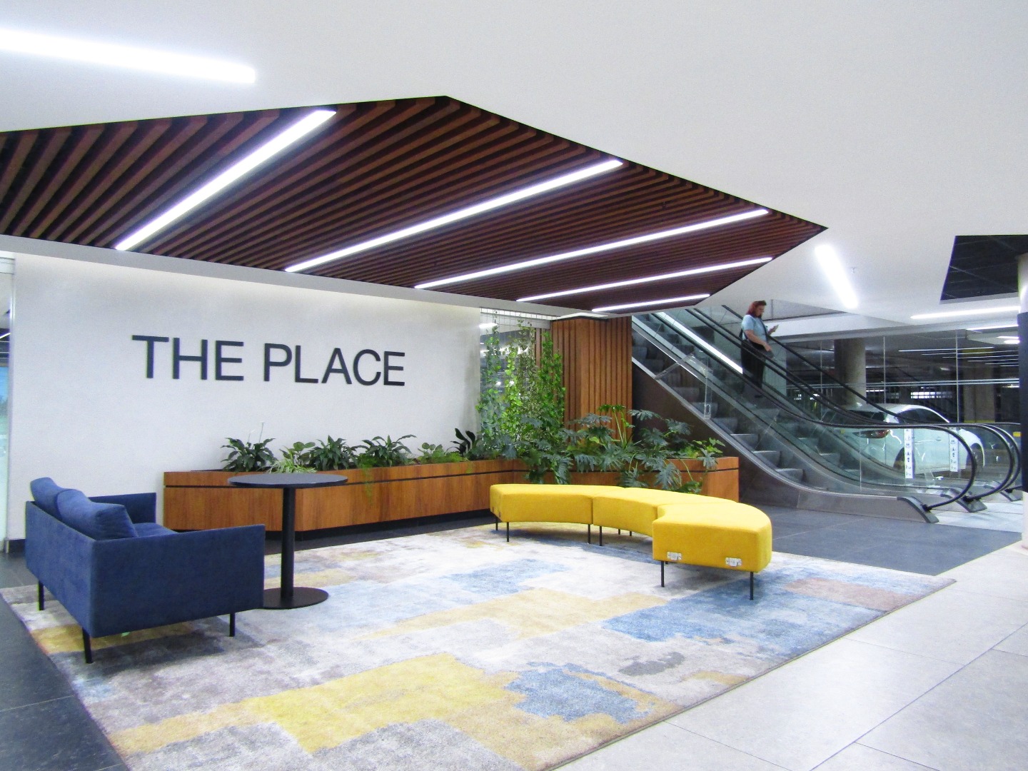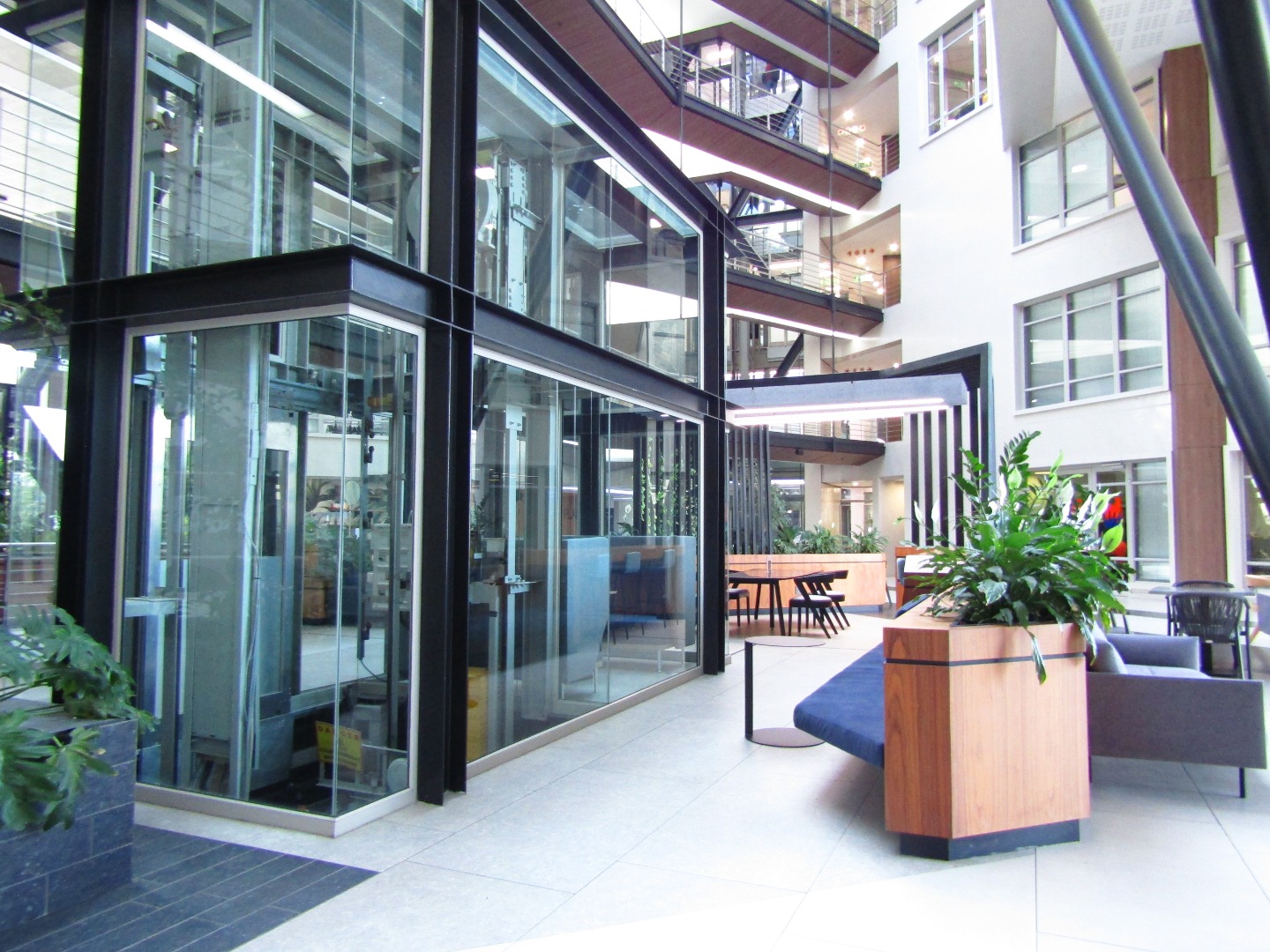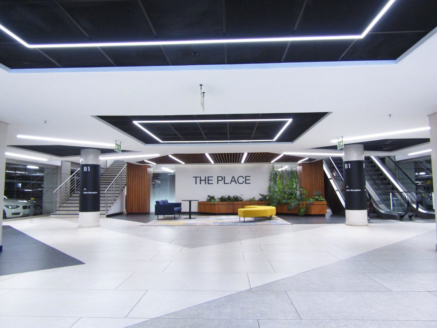 The property showcases a grand multi-level atrium flooded with natural light, featuring elevated walkways, stylish collaborative zones, and modern lobbies adorned with contemporary furnishings and lush greenery. Convenient escalator access ensures smooth circulation throughout the building, while the overall ambiance exudes professionalism and prestige.