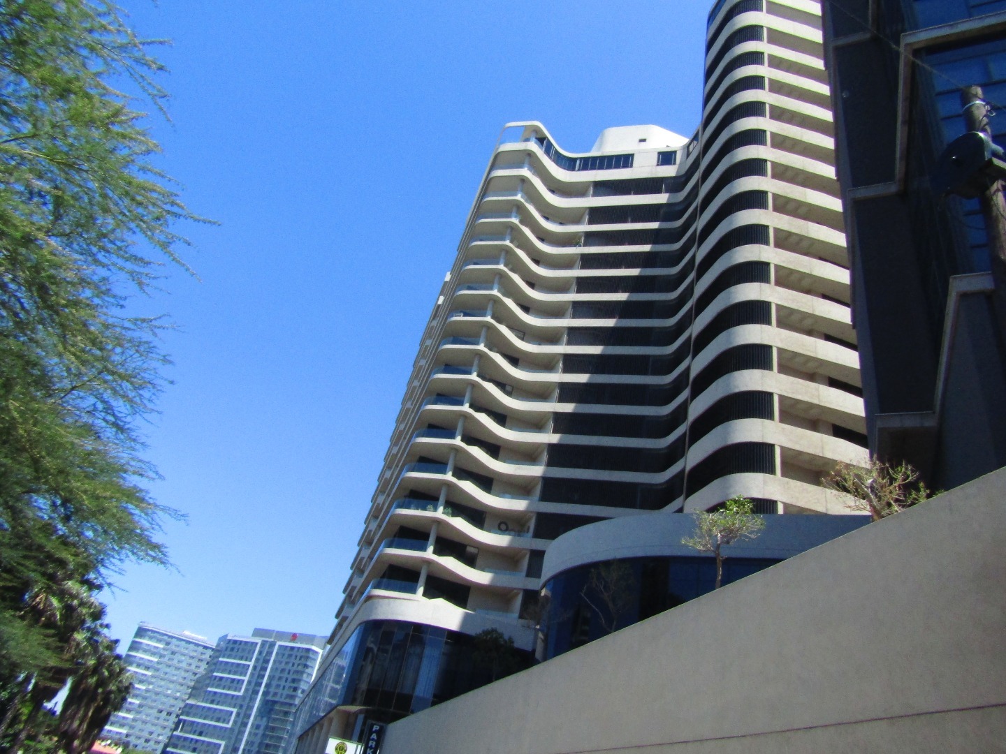 Exceptional commercial rental opportunity within a striking, modern mixed-use building in the heart of Sandton Central, South Africa. This impressive 252.00 sqm space offers a contemporary and versatile environment, ideal for businesses seeking a prominent address. The building's architectural design features extensive glass facades, ensuring abundant natural light floods the interiors, complemented by sleek grey concrete elements and the potential for private outdoor balcony access, enhancing the professional appeal.