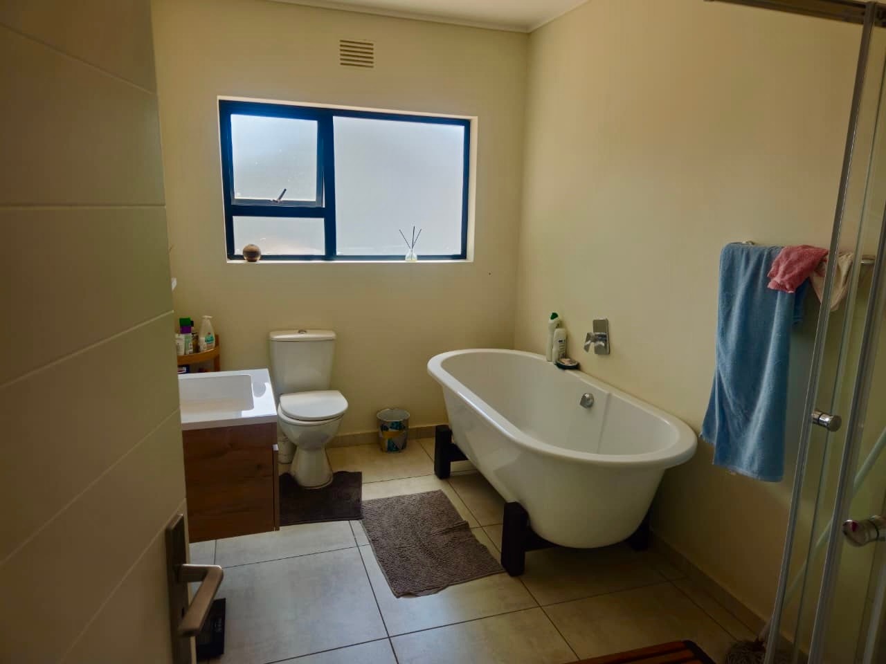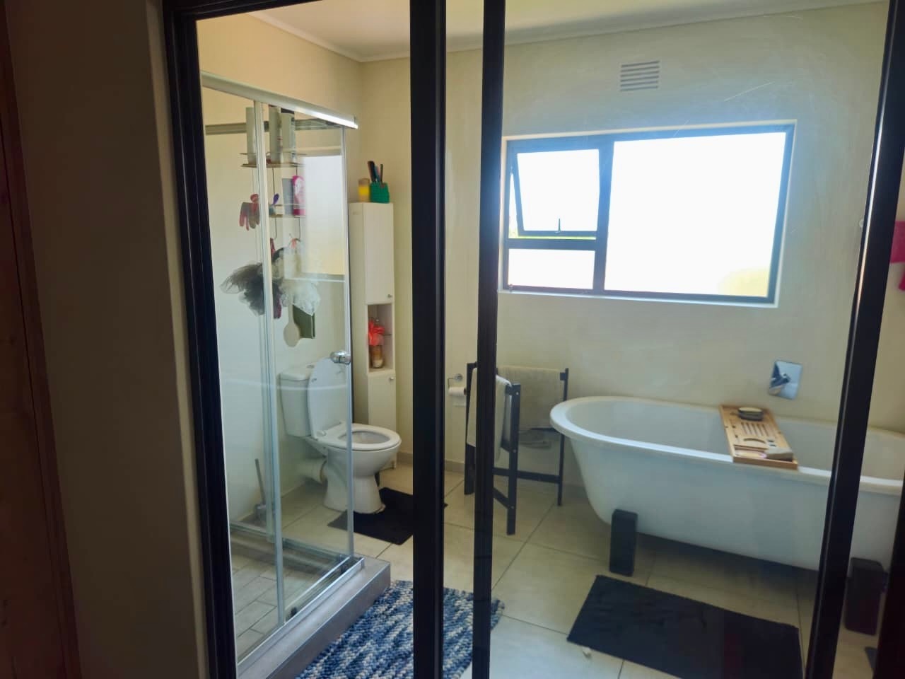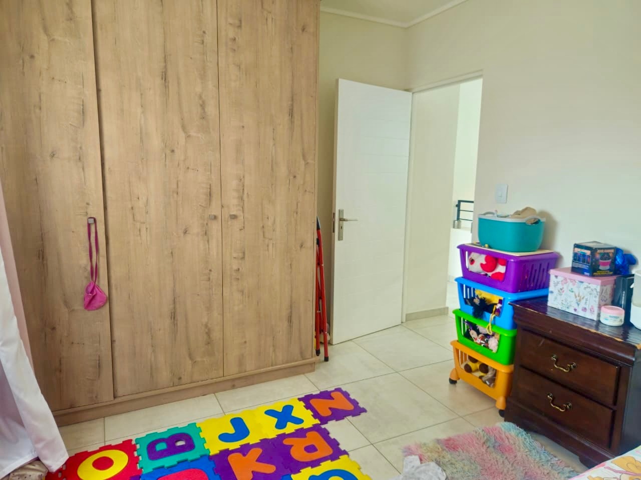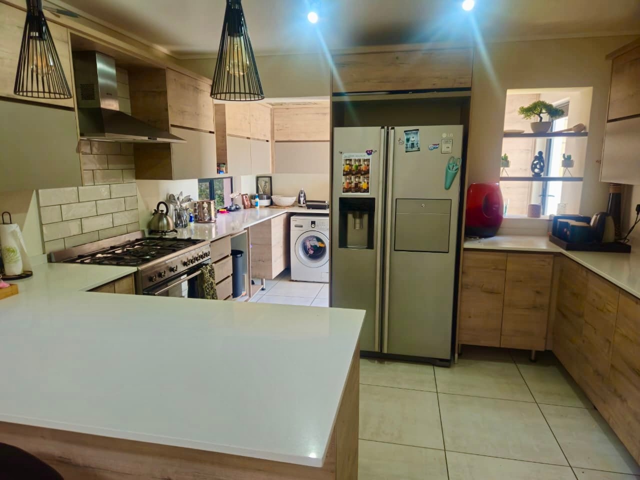 The property features three spacious bedrooms upstairs, two with their own en-suite bathrooms, ensuring privacy and comfort for the entire family. Downstairs, a formal lounge flows into an open-plan dining area and modern kitchen, while a separate dining room provides the perfect setting for more intimate gatherings. A covered patio extends the living space outdoors, ideal for weekend braais or evening relaxation. The double garage offers direct access into the home, combining security with convenience.