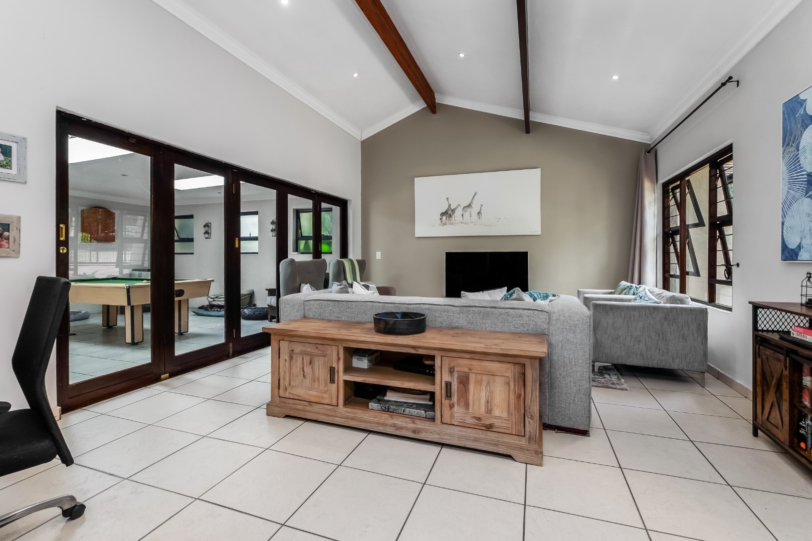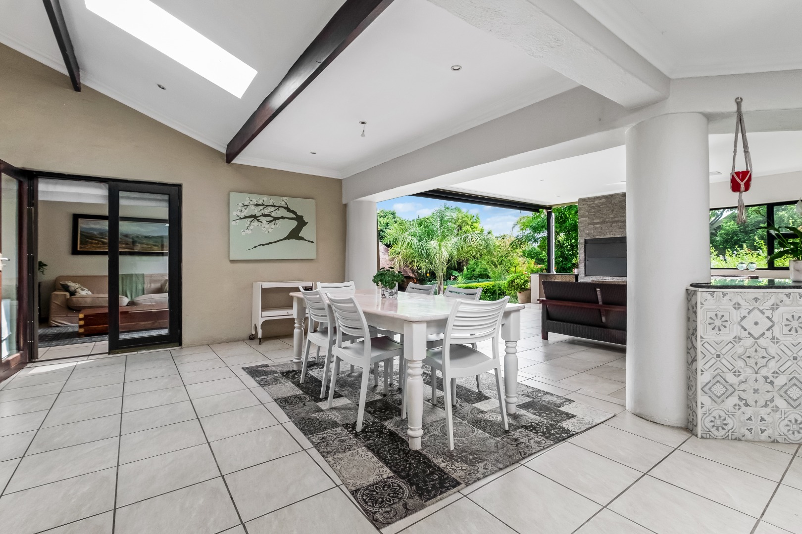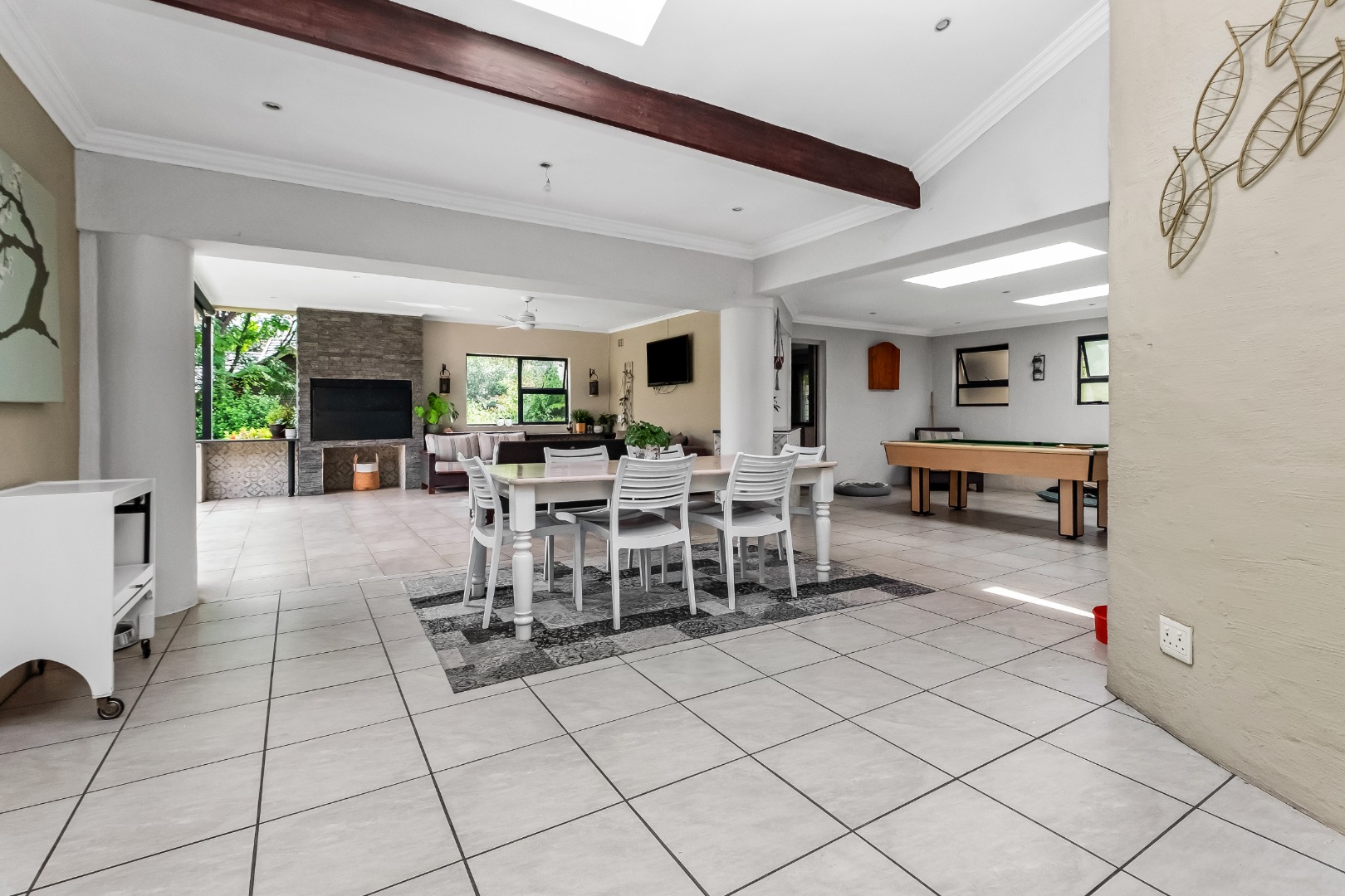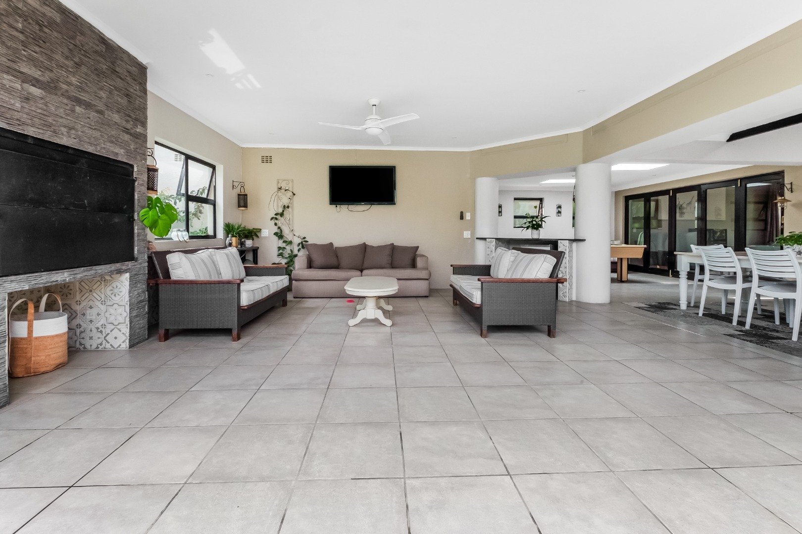 Step inside to discover a thoughtfully designed interior featuring an inviting entrance hall, two spacious lounges, including a comfortable family TV room with cozy fireplace for cooler evenings, which leads out to the expansive covered patio area. The centrally situated kitchen, with separate scullery, is open plan to the dining room and lounge. The kitchen offers double ovens and a glass hob with gas burner.