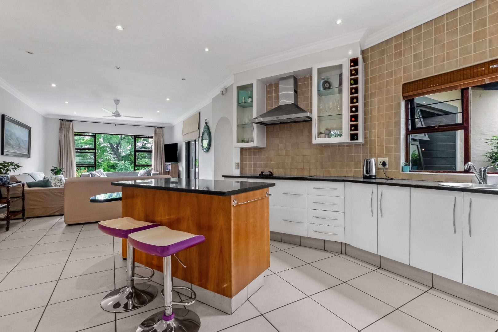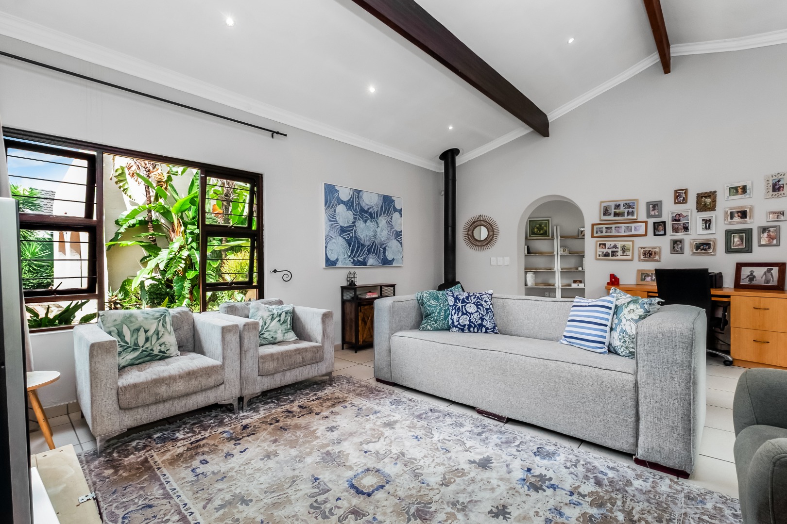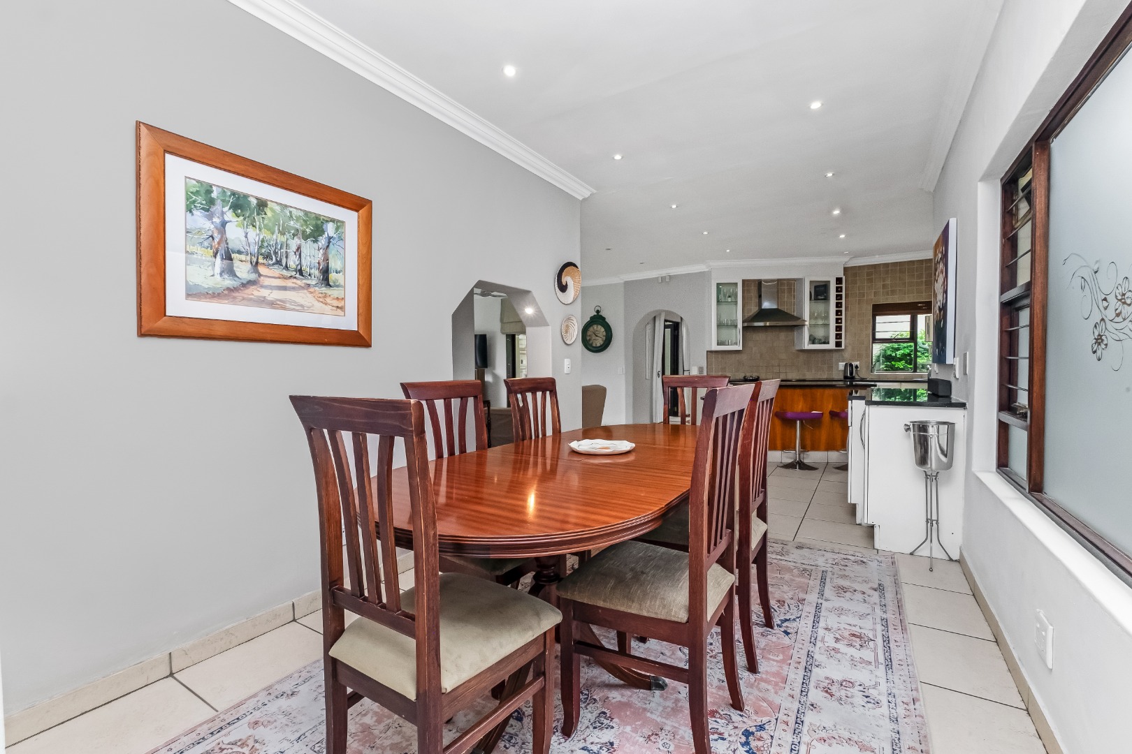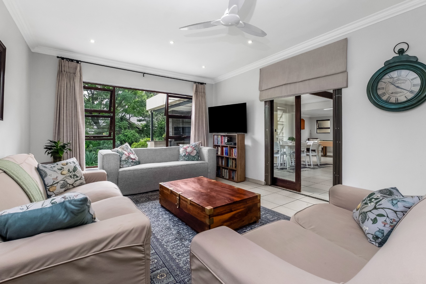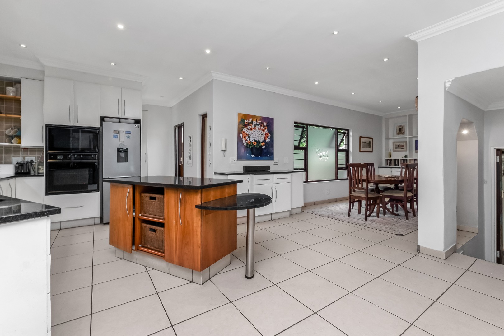 Step inside to discover a thoughtfully designed interior featuring an inviting entrance hall, two spacious lounges, including a comfortable family TV room with cozy fireplace for cooler evenings, which leads out to the expansive covered patio area. The centrally situated kitchen, with separate scullery, is open plan to the dining room and lounge. The kitchen offers double ovens and a glass hob with gas burner.