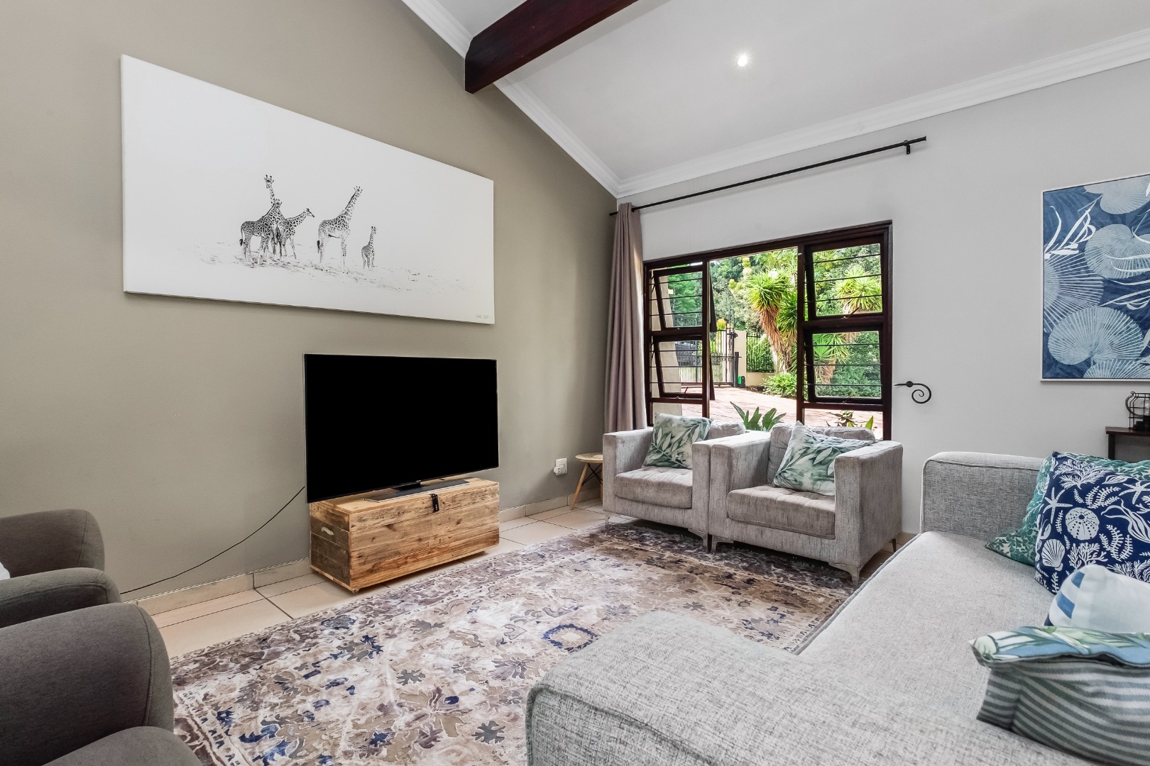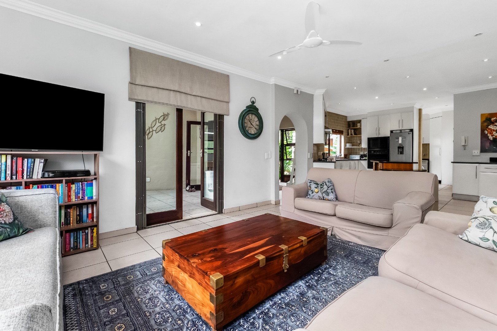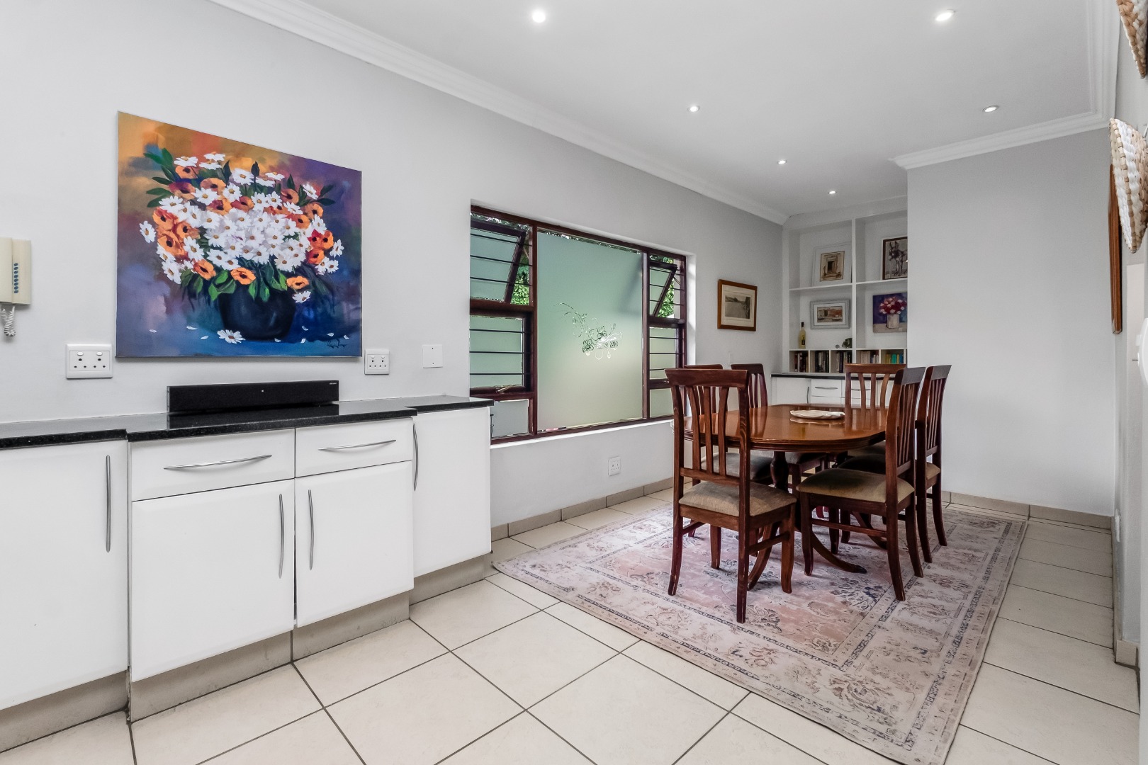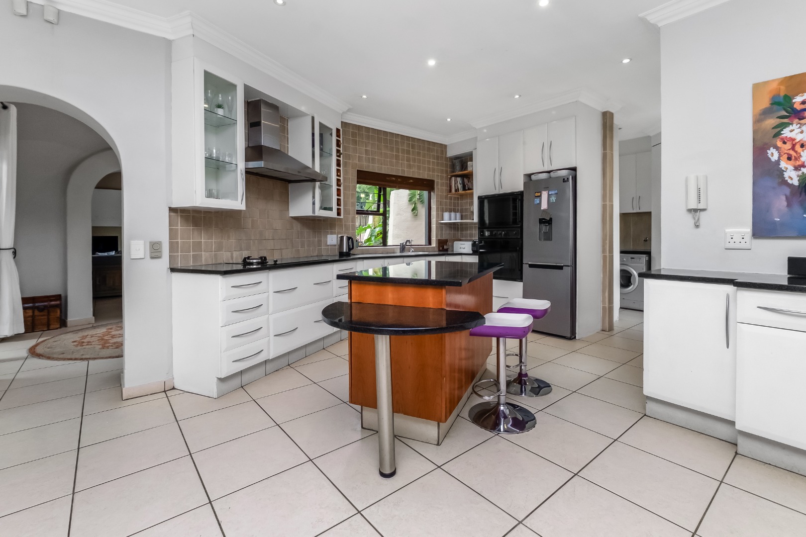 Step inside to discover a thoughtfully designed interior featuring an inviting entrance hall, two spacious lounges, including a comfortable family TV room with cozy fireplace for cooler evenings, which leads out to the expansive covered patio area. The centrally situated kitchen, with separate scullery, is open plan to the dining room and lounge. The kitchen offers double ovens and a glass hob with gas burner.