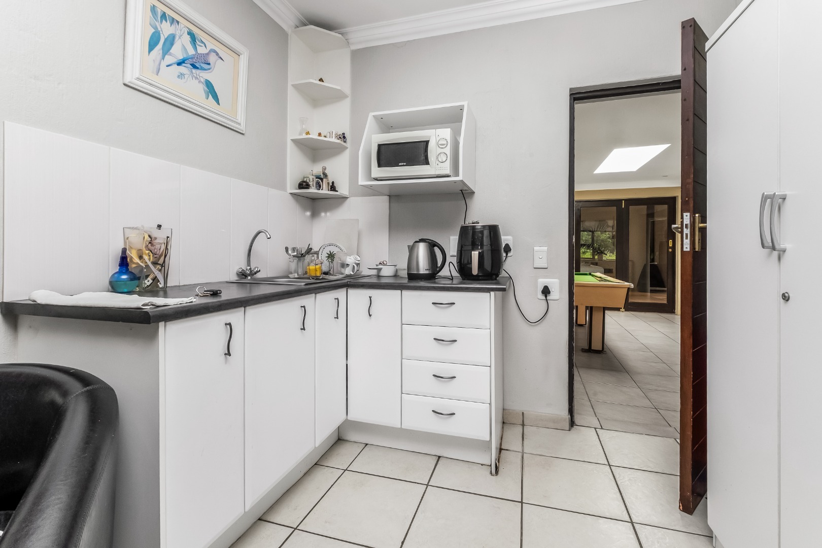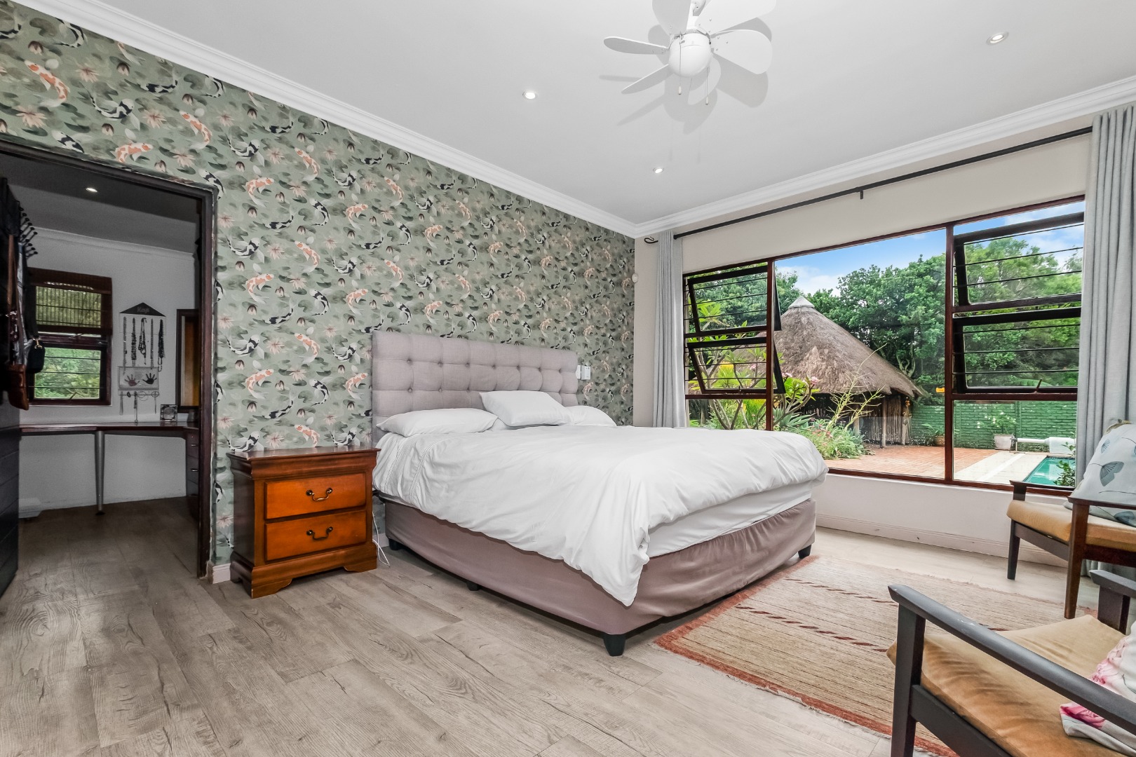 The accommodation comprises four generously sized bedrooms and three modern bathrooms, with two of these being en-suite, offering convenience and luxury. The 4th bedroom is a flatlet with kitchenette and en-suite shower room. Ideal for extended family, guest accommodation or a work from home area with its own entrance. Each space is designed for comfort, ensuring a private retreat for every family member. The property also boasts air conditioning for year-round comfort and fibre connectivity for modern living.
