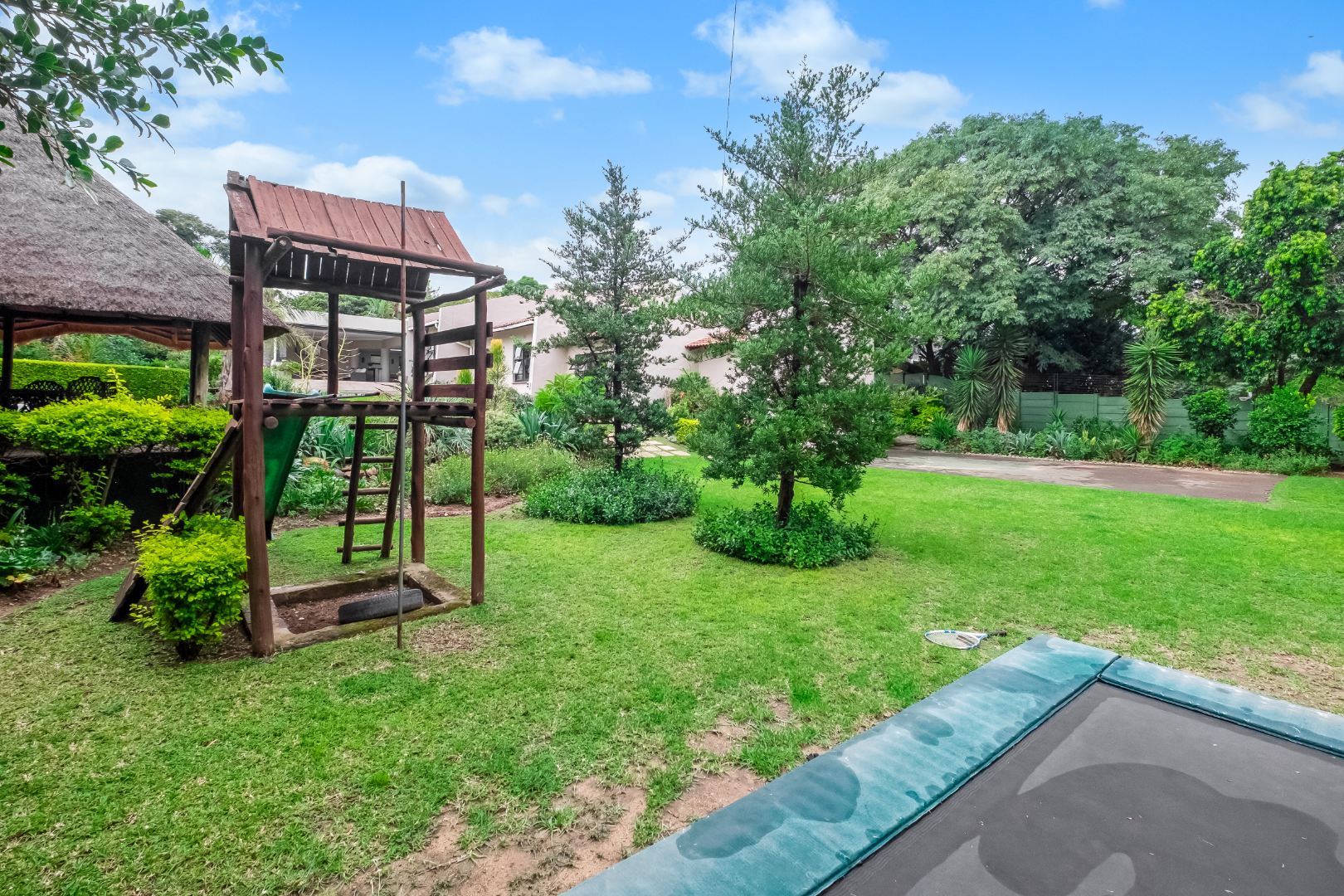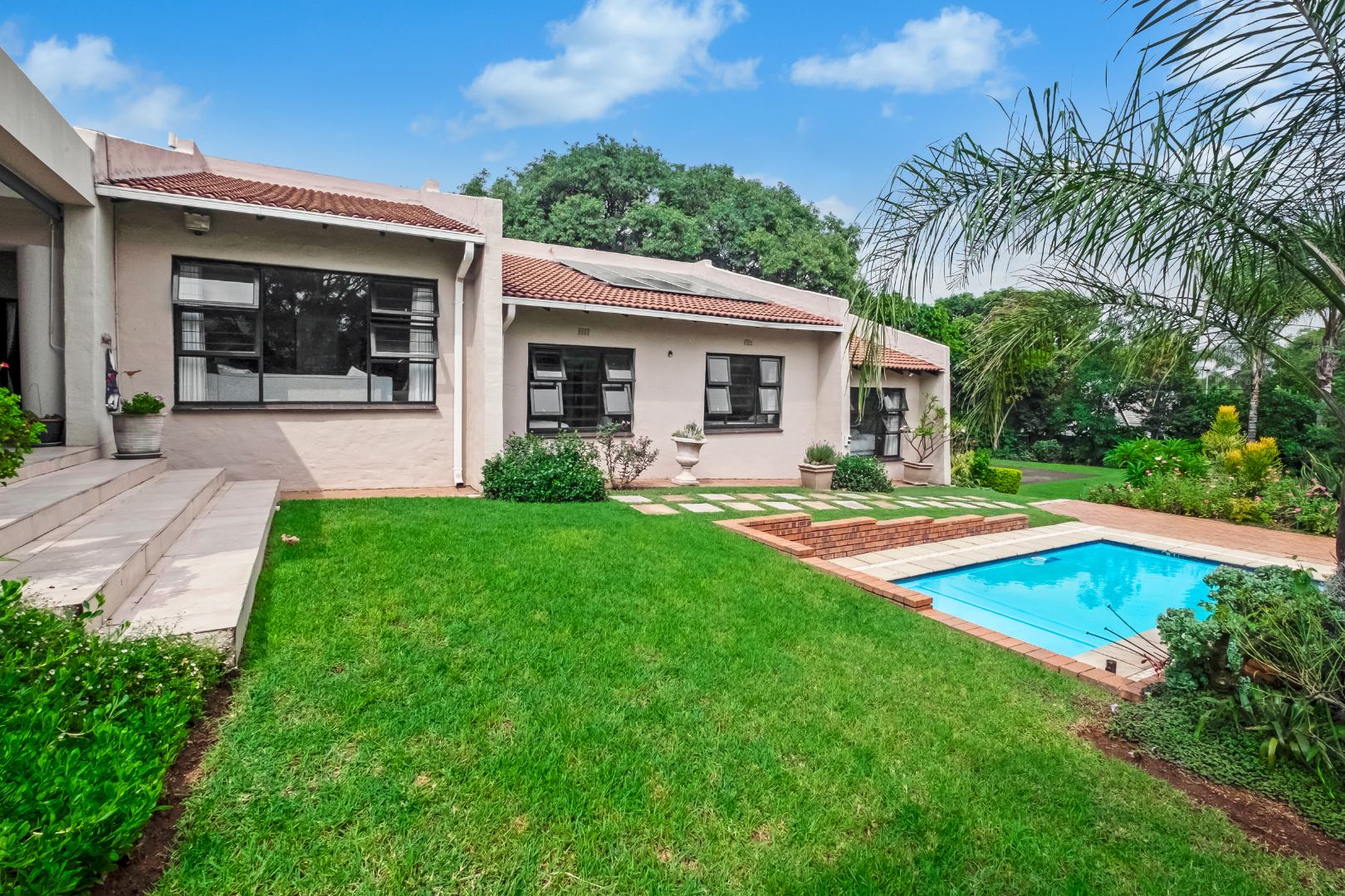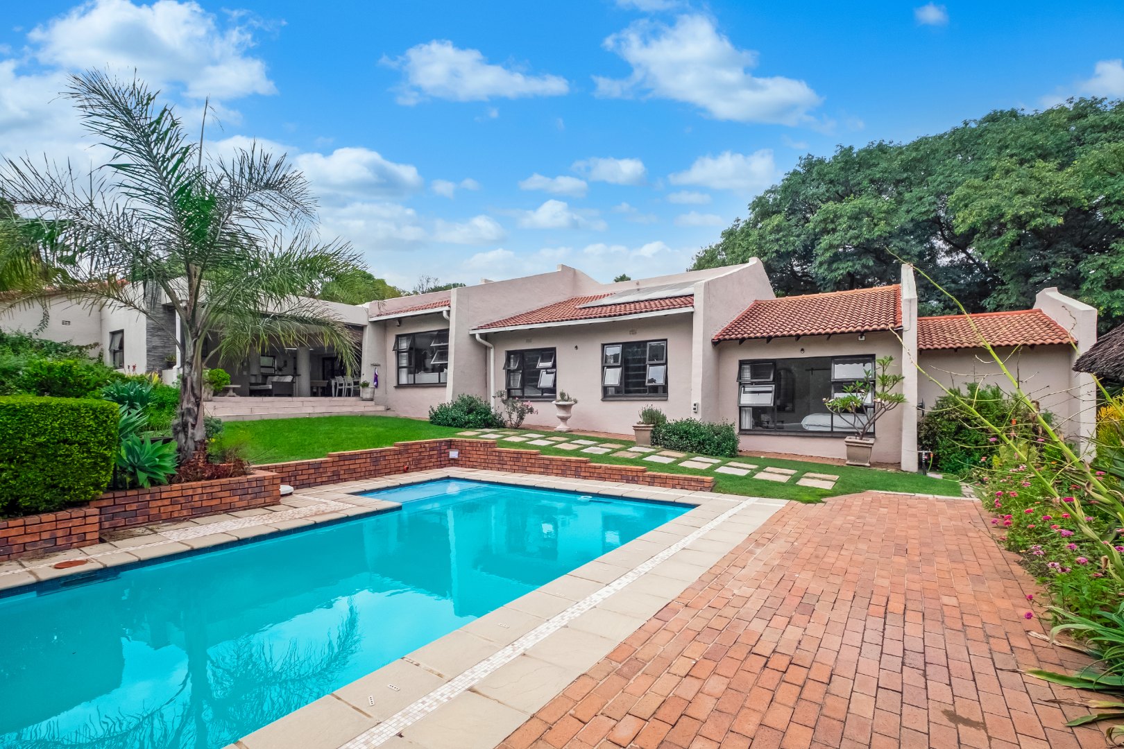 Outdoor living features a private swimming pool, large covered patio with built in braai, a charming lapa, all perfect for entertaining and relaxation. The beautiful, established garden benefits from a manual irrigation system and a borehole, ensuring lush greenery with ease. A water tank harvests rain water. Additional amenities include 2 x staff rooms with a shared bathroom, and ample parking with double garage, a carport and additional open parking spaces. Furthermore, the home is equipped with solar panels and a battery inverter system, offering energy efficiency and reliability.