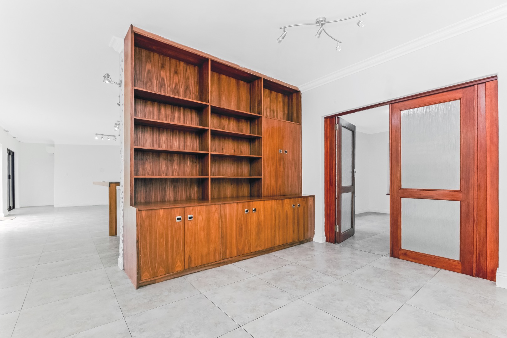 On the other side of the kitchen is a passage with security door and access to the downstairs bedroom wing with three north facing bedrooms, alll with views of pool and garden, full bathroom.