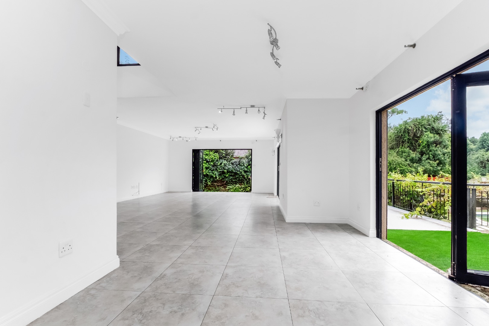 Entrance hall with guest toilet and double volume super spacious interleading living spaces. Stack back aluminium doors blend indoor and outdoor living, overlooking fabulous patio, garden, swimming pool and tennis court.