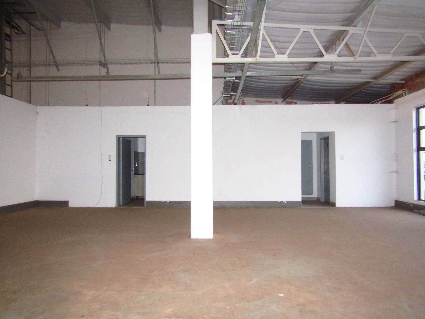 The interior is characterized by a spacious, open-plan layout with impressive high ceilings and exposed industrial-style trusses and conduit, offering a contemporary aesthetic. Newly painted white walls provide a clean canvas, complemented by a raw concrete floor awaiting your specific finishes. This adaptable environment is ideal for a wide range of businesses seeking a customisable workspace, from offices to light industrial or retail applications. The unit includes a modern, compact kitchenette with a double stainless steel sink and four well-appointed bathrooms, catering to staff and visitor needs.