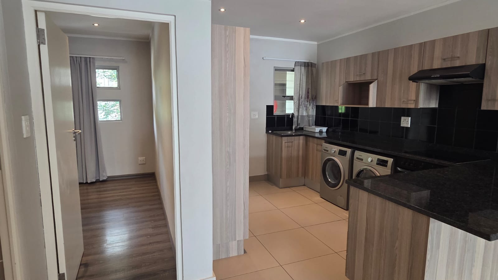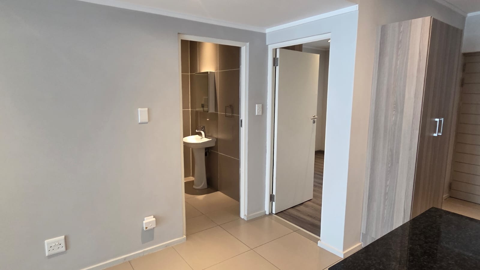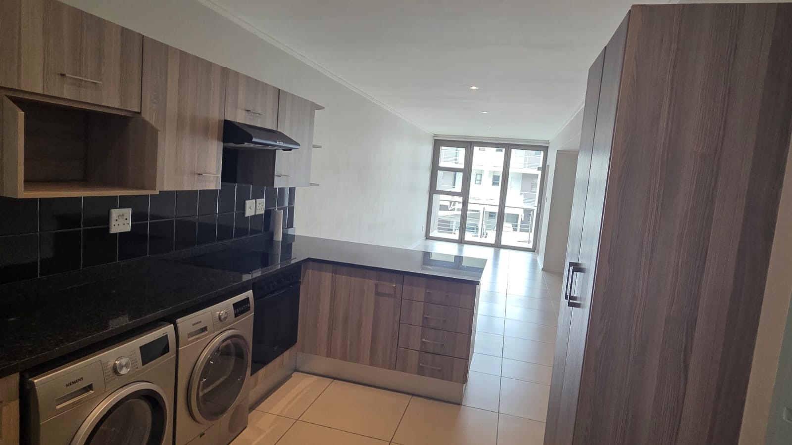 This modern apartment in Edenburg, Sandton, offers a sophisticated rental opportunity with two bedrooms and two bathrooms, including one en-suite. The interior boasts a contemporary open-plan design, seamlessly connecting the living area with a well-appointed kitchen. The kitchen features stylish wood-grain cabinetry, sleek black countertops, a convenient breakfast bar, and integrated spaces for washing appliances, complemented by a built-in hob and extractor fan. Throughout the main living spaces, durable tiled flooring and recessed ceiling lighting create a bright and inviting atmosphere, enhanced by good natural light.