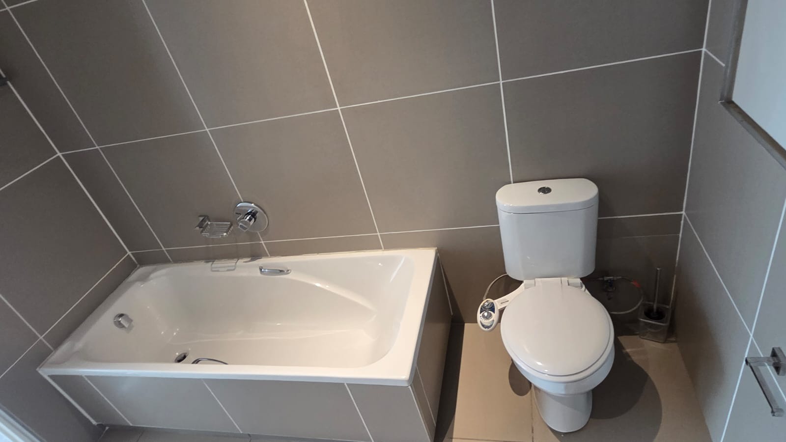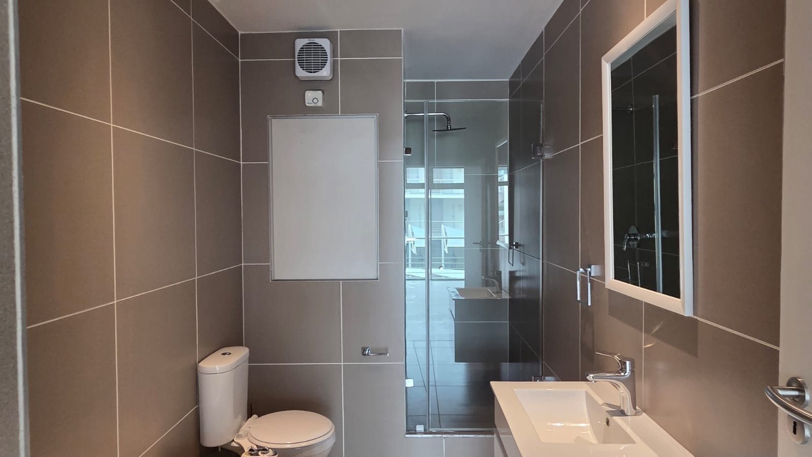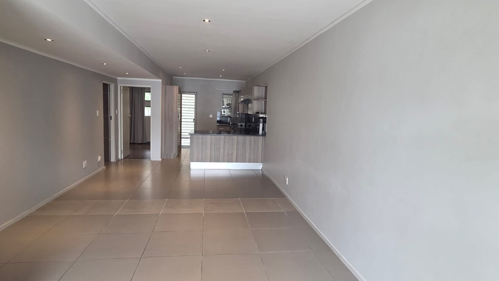 This modern apartment in Edenburg, Sandton, offers a sophisticated rental opportunity with two bedrooms and two bathrooms, including one en-suite. The interior boasts a contemporary open-plan design, seamlessly connecting the living area with a well-appointed kitchen. The kitchen features stylish wood-grain cabinetry, sleek black countertops, a convenient breakfast bar, and integrated spaces for washing appliances, complemented by a built-in hob and extractor fan. Throughout the main living spaces, durable tiled flooring and recessed ceiling lighting create a bright and inviting atmosphere, enhanced by good natural light.