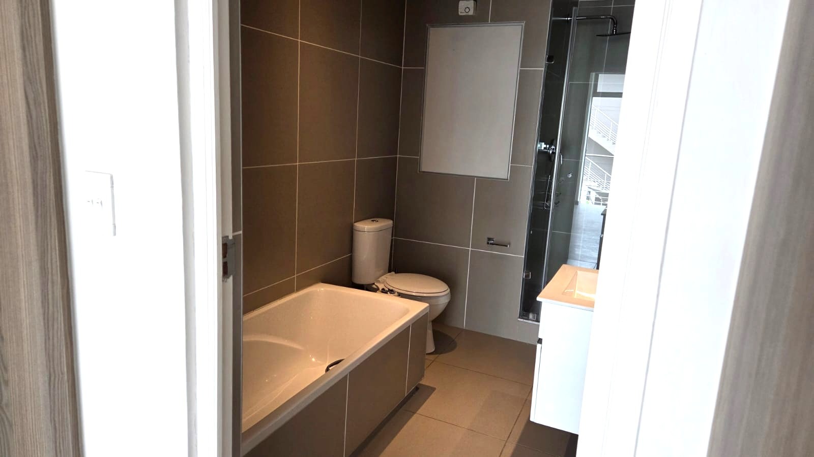 The two comfortable bedrooms are designed for relaxation, with one benefiting from a private en-suite bathroom. Both bathrooms are modern, featuring tiled walls and neutral finishes. Bedrooms are fitted with generous built-in wardrobes and modern wood-look laminate flooring, offering ample storage and a clean aesthetic. The apartment also includes a private balcony, providing an outdoor extension to the living space.