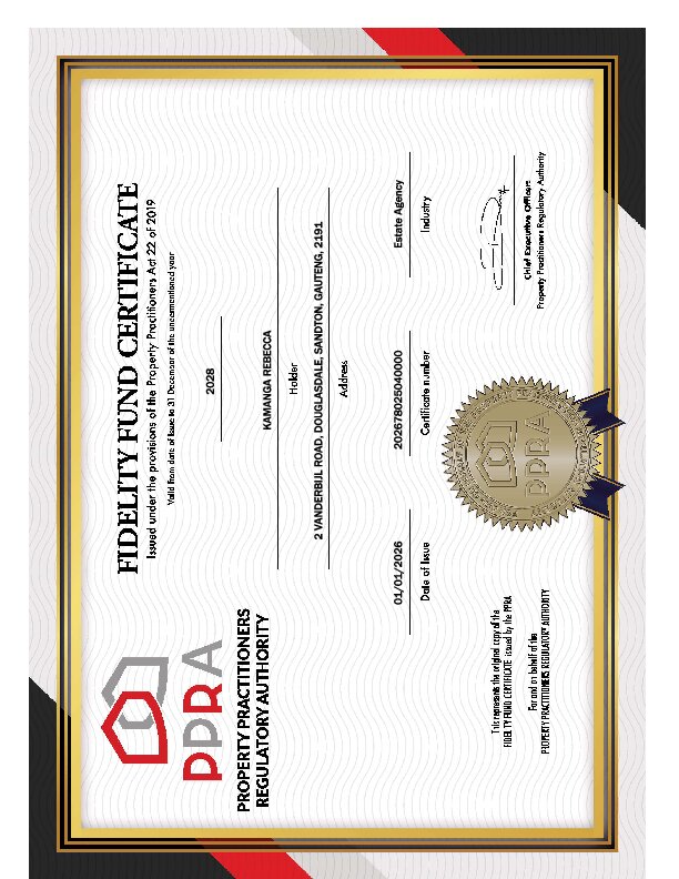 About Rebecca Kamanga Title: Candidate Property Practitioner Registered with the PPRA FFC Number: 202678025040000